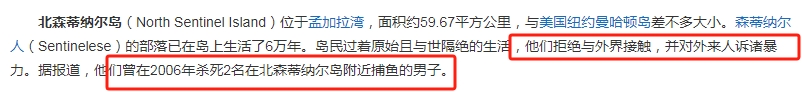 可能大家不太知道北哨兵岛,北哨兵岛地处孟加拉湾,岛上的居民过着原始且与外界完全隔绝的生活,时间都可以追溯到6万年之前,他们的生活方式,也依旧保持着原始人的方法,而且对于外来的入侵者提倡采用暴力手段。网传,这些岛民曾经杀死多名在北哨兵岛附近捕鱼的男子。