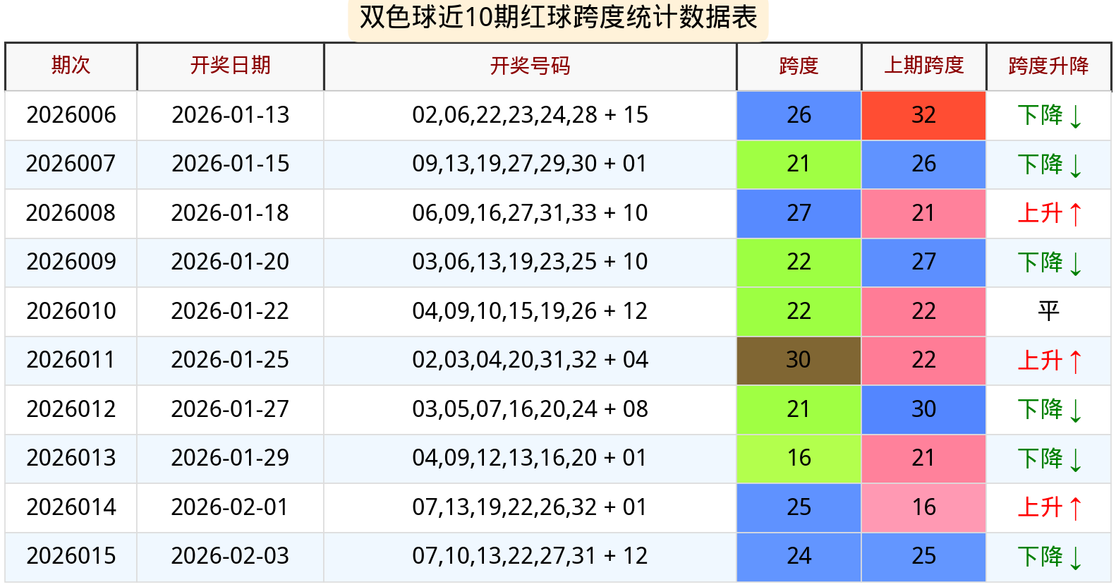 2. 红球跨度:24为中枢,收敛信号明确近3期跨度:30→16→24,呈现“高→低→中”修复轨迹。24恰为10期均值(23.4)上方,且2026013(跨度16)后连续两期回升,符合“极值修复不过三”规律。下期22–25区间概率达65%,对应红球最大最小号差需稳定在该范围,利好中高位三区(23–33)与一区(01–11)形成跨区张力,如10/11与23/30/33组合。
