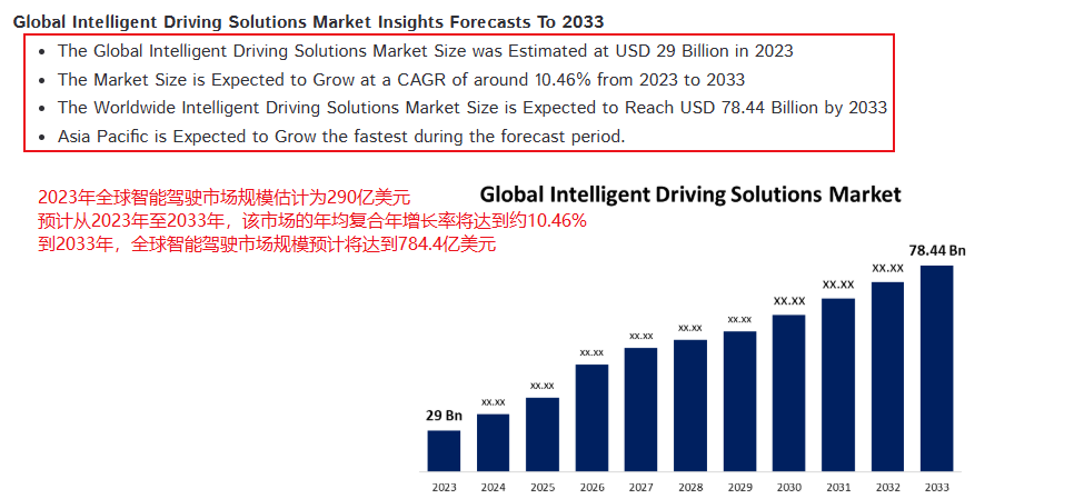 根据Spherical Insights的数据,2023年全球智能驾驶市场规模约为290亿美元,预计2023–2033年的年均复合增长率将保持在约10.46%,到2033年市场规模有望突破784亿美元。