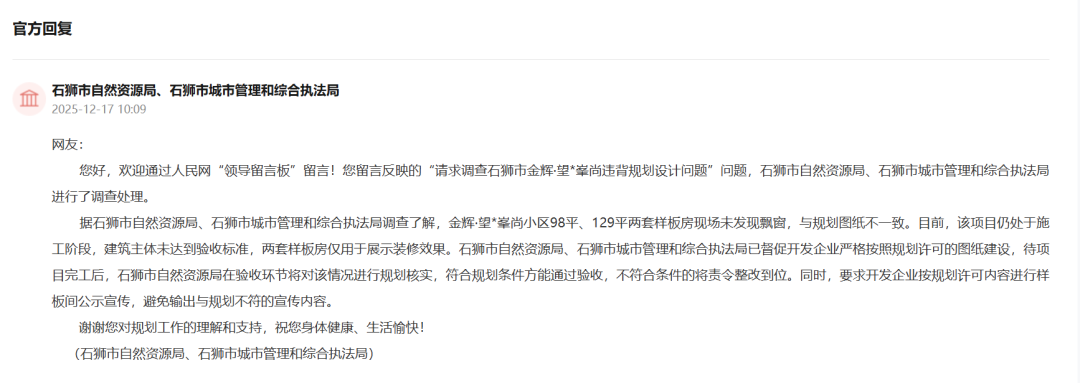 对此,2025年12月17日,石狮市自然资源局、石狮市城市管理和综合执法局进行了回复: