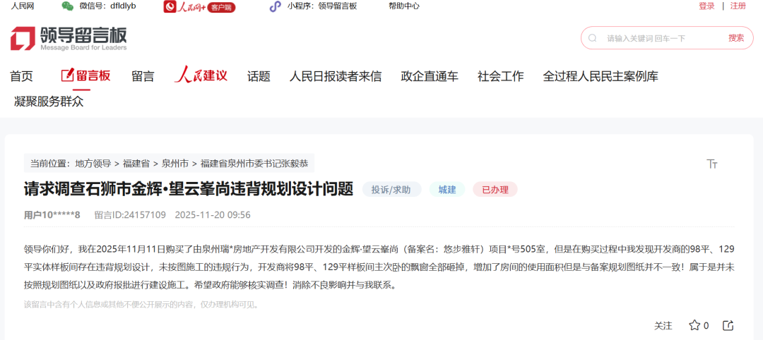 2025年11月,有网友在人民网地方领导留言板反映“请求调查石狮市金辉·望云峯尚违背规划设计问题”事项:购买了由泉州瑞耀房地产开发有限公司开发的金辉·望云峯尚(备案名:悠步雅轩)项目,但是在购买过程中我发现开发商的98平、129平实体样板间存在违背规划设计,未按图施工的违规行为,开发商将98平、129平样板间主次卧的飘窗全部砸掉,增加了房间的使用面积但是与备案规划图纸并不一致!属于是并未按照规划图纸以及政府报批进行建设施工。