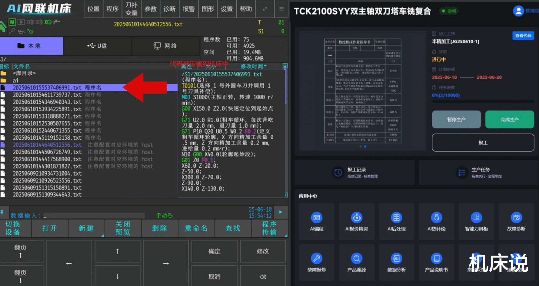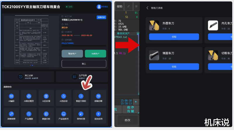 生产流程的碎片化,往往导致效率隐性损耗。山东大汉智能科技有限公司的 AI 机床,通过全流程协同设计打破这一困局:智能刀具柜让领用流程更高效,员工在系统中选择所需刀具后,即可获取 6 位数取刀码,在终端输入后柜门自动开启,无需人工登记,领刀时间从平均 10 分钟压缩至 2 分钟;一键派工功能则简化了任务下发流程,在生产任务中选定待投产项目点击提交,加工图纸、程序便自动同步至机床,无需人工传输,投产后即可直接开工。搭配智能报工功能,加工数量、时长等数据自动采集,一键提交即可完成报工,历史记录支持修改删除,让生产管理更清晰高效。