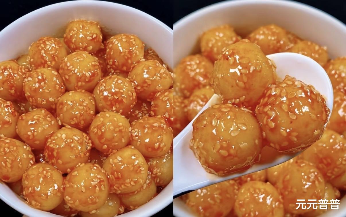 炒好之后红亮亮的酱汁裹着金黄的土豆球,撒上白芝麻,看着就让人流口水。