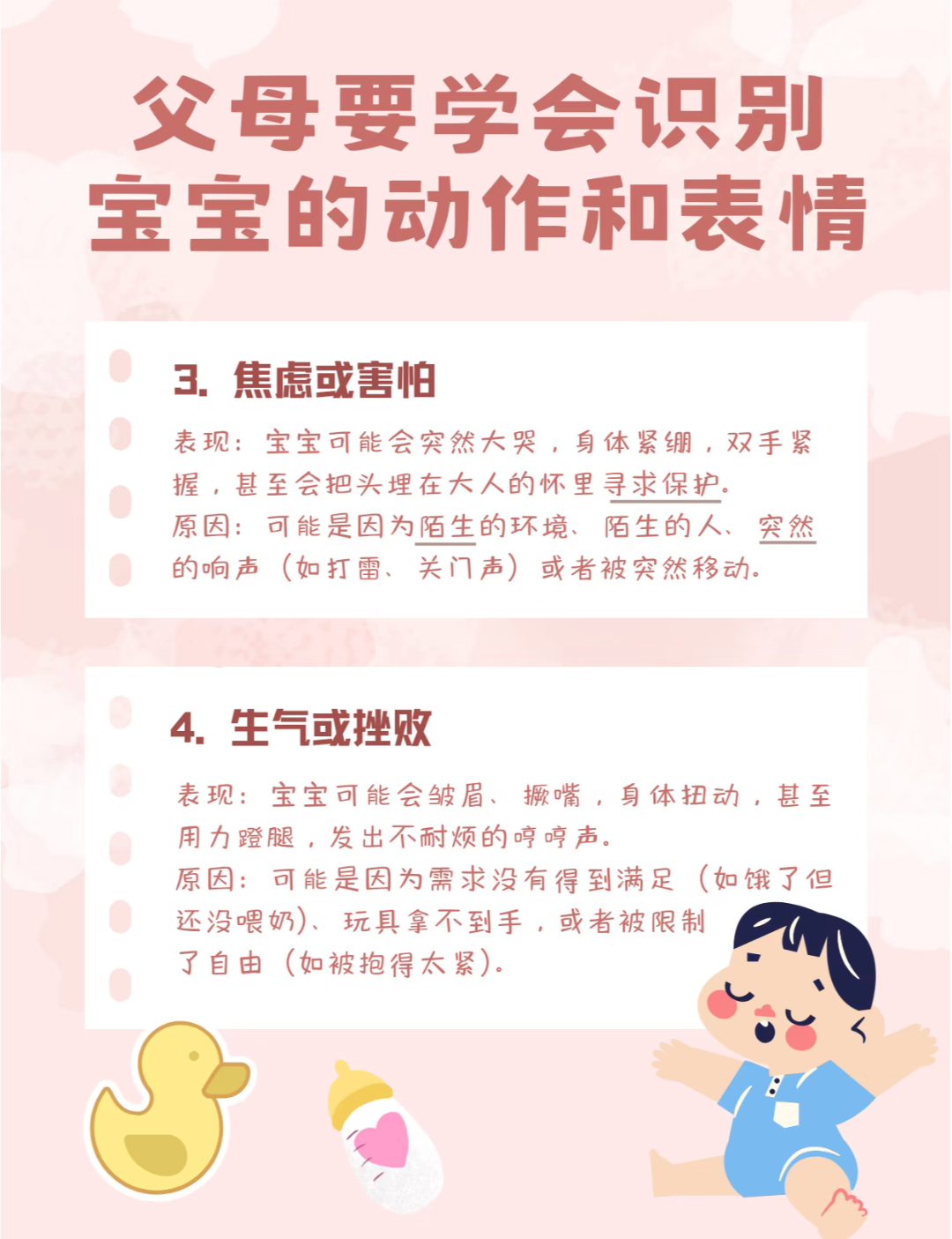 更强烈的情绪,比如害怕和生气,宝宝也会明确地表达出来。如果宝宝突然放声大哭,身体紧绷,小手紧紧握成拳头,甚至把头往你怀里钻,那他很可能是被陌生的环境、突如其来的响声吓到了,他在寻求你坚实温暖的保护。而当他撅起小嘴,皱着眉,不耐烦地蹬腿和哭闹时,则可能是在表达他的小“愤怒”和“挫败感”。也许是心爱的玩具够不着,也许是肚子饿了但奶还没来,这些小小的不如意,在他的世界里可是天大的事。