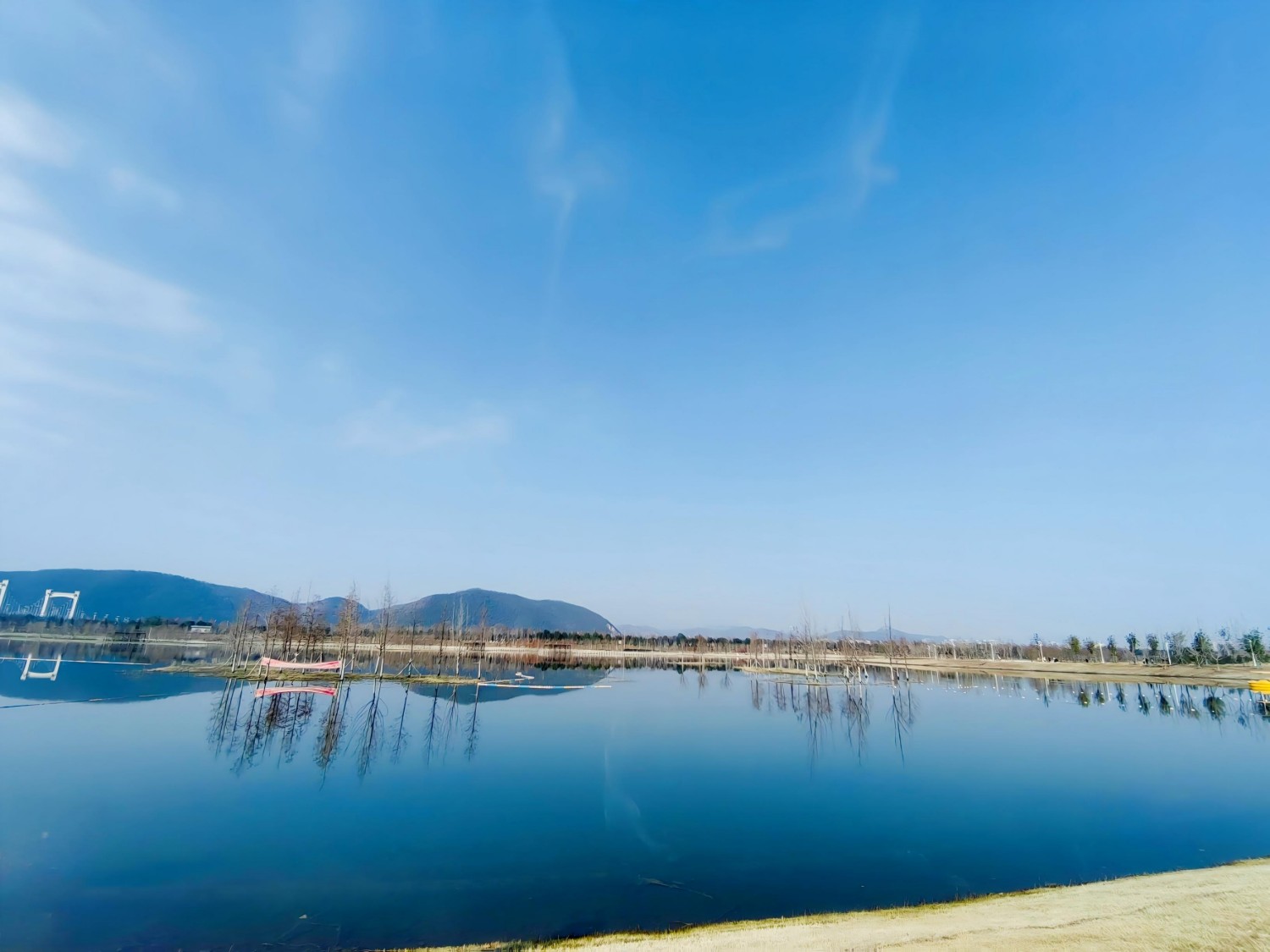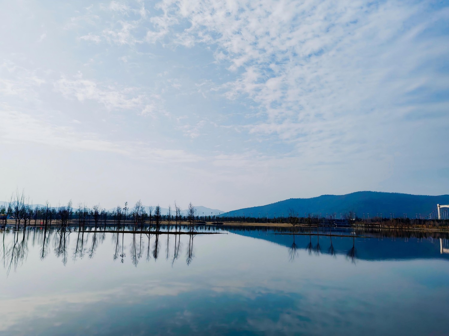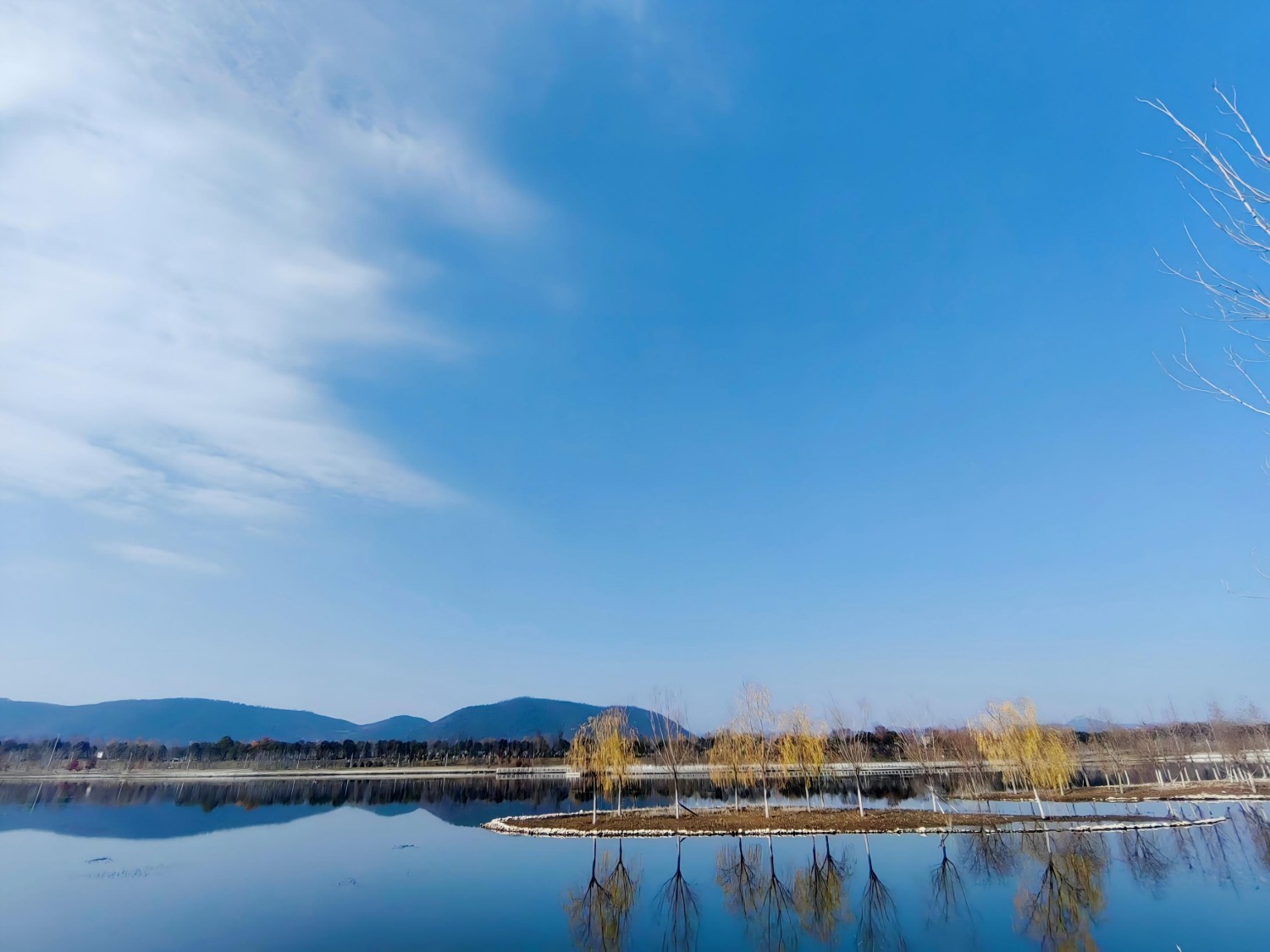 苍山隐雾,树木临风,水域泱泱湟湟,沿途十步成景,百步成画。水溶天地,碧空映澄湖,远山倒影漾清波,冬树飒飒依岸立。时有飞鸟惊空,携一缕灵动划破寂静,散出天地间自然韵意来。