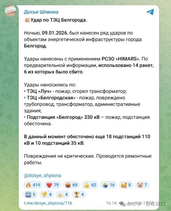 俄罗斯别尔哥罗德遭到14枚HIMARS火箭弹袭击,导致卢奇热电厂的变压器被摧毁,330千伏的“别尔哥罗德”变电站停止运行,28个小型变电站断电,整个别尔哥罗德几乎全部停电。