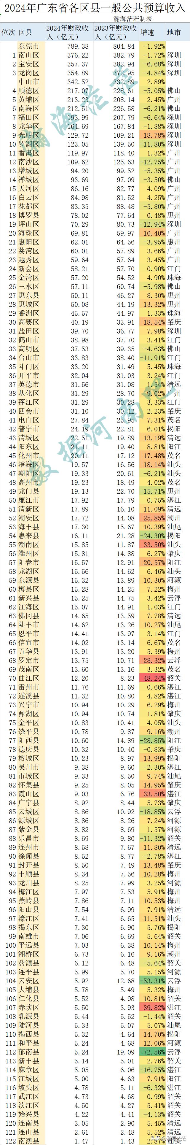 2024年广东省各区县一般公共预算收入和增速具体如下图所示: