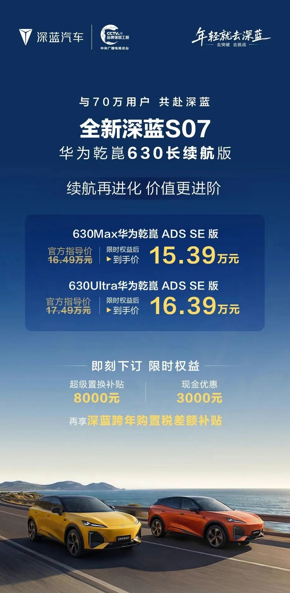 值此高光时刻,深蓝S07 华为乾崑630长续航版重磅上市,推出630Max华为乾崑ADS SE版、630Ultra华为乾崑ADS SE版两款车型,官方指导价分别为16.49万元、17.49万元。叠加现金优惠与置换补贴后,限时权益价下探至15.39万元、16.39万元,以越级产品力为15万级纯电市场再添重磅力作——