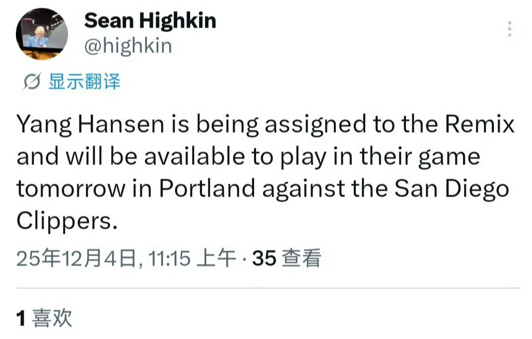 根据开拓者队记的报道,杨瀚森再度被开拓者下放发展联盟,12月5日将出战对阵圣地亚哥快船的比赛。这是杨瀚森本赛季第三次被下放到发展联盟,第一次是训练,第二次打了两场比赛,这一次又会迎来新的比赛。对于小杨来说,在发展联盟打球也不错,最起码有稳定的上场时间,而且还能打首发。