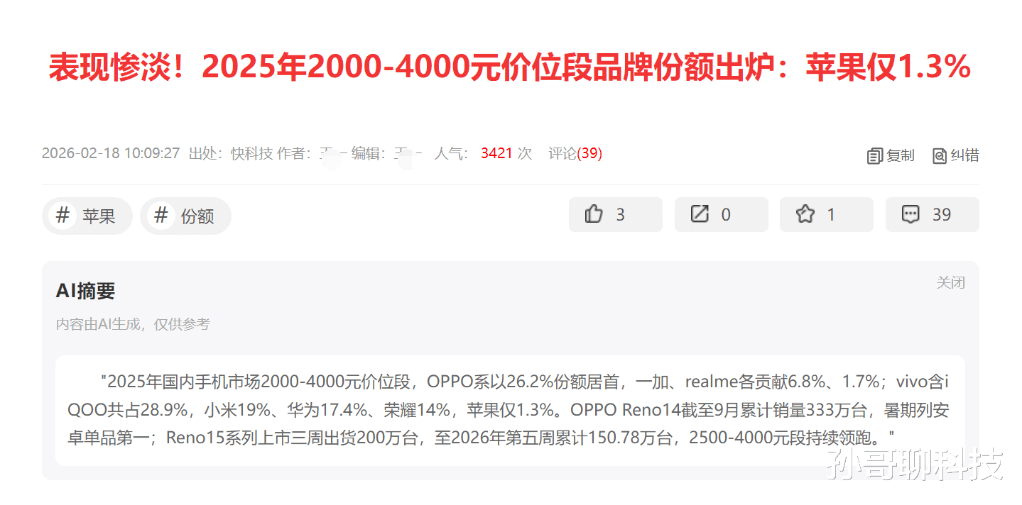 许多网友看到该文章有点懵,什么叫苹果在该价位段份额仅有1.3%?苹果近几年没推出过2000~4000元价位段手机。iPhone17系列售价5999元起售,iPhone 16e起售价也达到4999元,从来没有4000元以下价位手机,何谈份额?