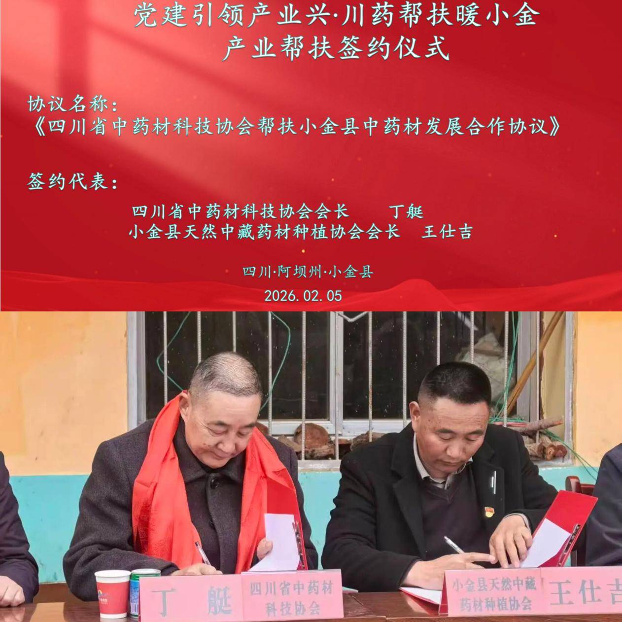 座谈结束后,活动进入核心签约环节。第一项为产业帮扶签约,四川省中药材科技协会丁艇会长与小金县天然中藏药材种植协会会长王仕吉共同签署《四川省中药材科技协会帮扶小金县中药材发展合作协议》,明确从技术、标准、渠道、品牌四大维度为小金中药材产业提供支撑。