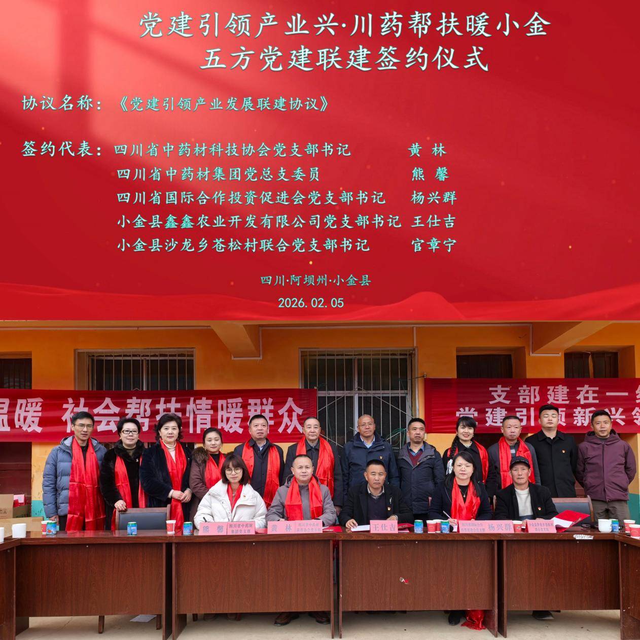 第二项为五方党建联建签约,四川省中药材科技协会党支部书记黄林同志、四川省中药材集团党支委熊馨同志(代表书记郭鼎同志)、四川省国际合作投资促进会支部书记杨兴群女士、小金县鑫鑫农业开发有限公司党支部书记王仕吉同志、小金县沙龙乡苍松村联合党支部书记官章宁同志。五位代表签署协议,标志着“党建引领、协同发展”的帮扶模式正式落地,为革命老区乡村振兴提供可复制样本。