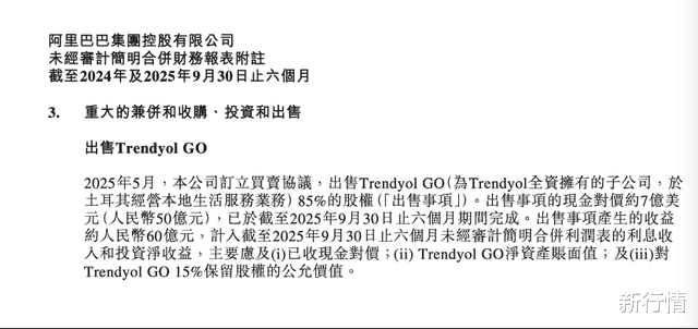 近日,阿里巴巴集团在2026财年中期报告中披露,2025年5月,公司订立买卖协议,出售Trendyol GO 85%的股权。出售事项的现金对价约7亿美元,已于截至2025年9月30日止六个月期间完成。