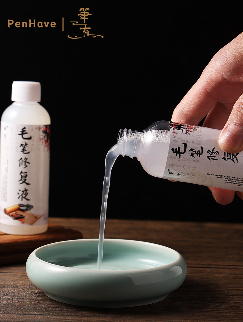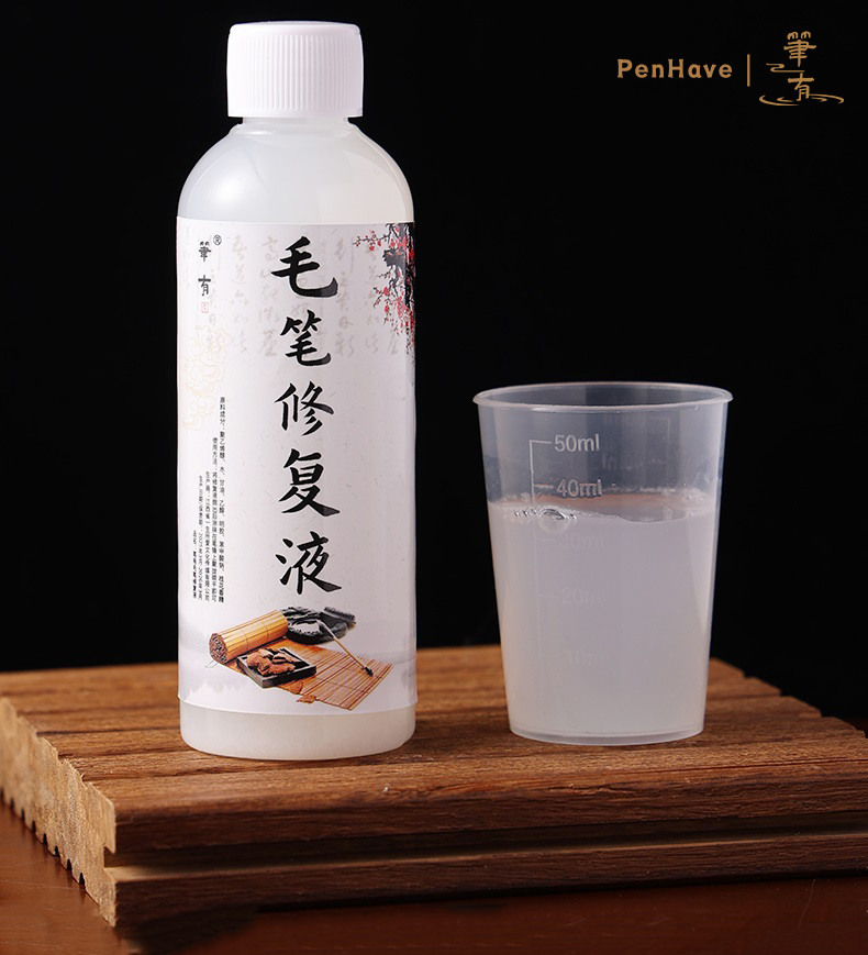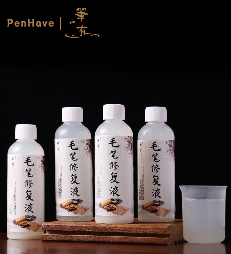 值得一提的是,在这个修复过程中,我们已经将胶体灌装至塑料瓶中商品化,使用和携带更加方便——PenHave笔有毛笔修复液,专注于传统书写工具的修复。