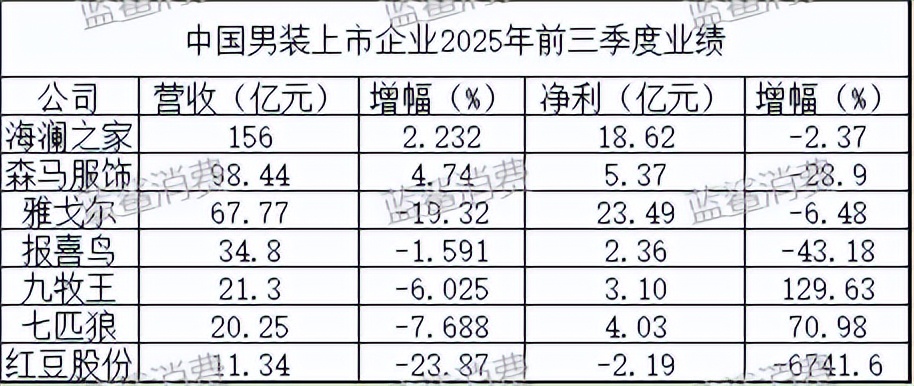 男装消费市场也下滑严重。从2025年前三季度财报来看,知名男装上市公司中,仅有海澜之家和森马服饰营收增长,增幅分别为2.2%和4.7%;大多数男装上市公司“增收不增利”,仅有九牧王和七匹狼净利同比增长。