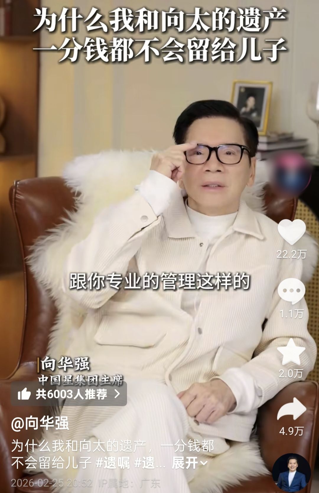 2月25日,向华强录了一期视频,称自己和向太已经商量好了,一分钱也不会留给两个儿子,而是会把遗产全权交给儿媳妇郭碧婷打理。