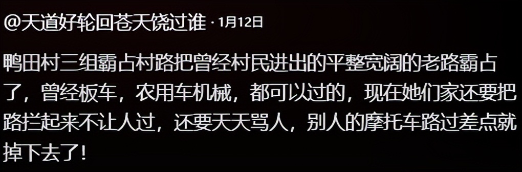 更让人气愤的是,自从村民跟这户人家提议完之后,只要有人村民从那路过,这户人家的女主人就扯着嗓子在那骂,把平常从那路过的孩子都吓得不敢走了。