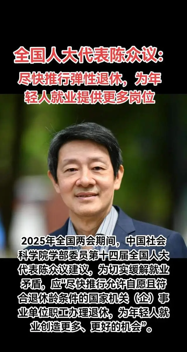 在2025年全国两会召开期间,全国人大代表陈众议聚焦就业市场结构性矛盾,提出一项引发广泛热议的建议:允许机关事业单位工作人员以及企业职工在工龄达到30年后,可自愿申请提前退休,以此为年轻人创造更多就业机会与发展空间。这一建议若能落地实施,其影响将远超单纯调整工资待遇的范畴,堪称对体制内外就业格局的一次深度重塑。下面我们围绕政策覆盖范围、社会效益及改革深意展开详细探讨。