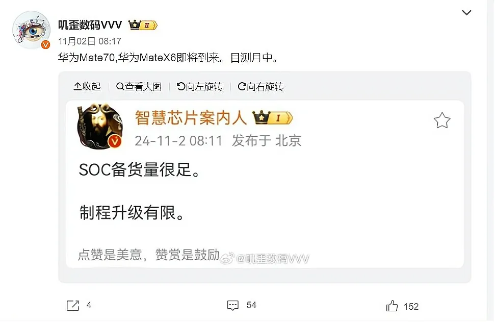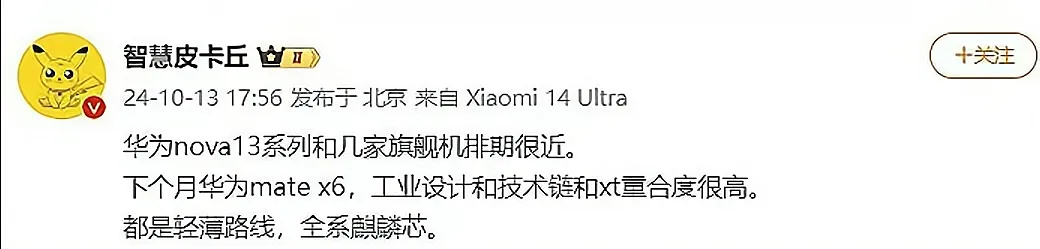现在全网的花粉都在等待华为Mate70系列发布,预计就在这个月19号左右。但实际上,除了华为Mate70系列外,其实还有一款大折叠屏手机,很可能会同时亮相,而且升级力度和惊艳程度,几乎不输华为Mate70。这就是华为下一代折叠屏手机MateX6。值得一提的是,这款华为手机在配置方面与华为Mate70系列一样,都将搭载全新麒麟芯片。许多花粉可能会担心,麒麟芯片备货是否充足。但从目前的爆料来看,华为Mate70系列和华为MateX6早就已经开始量产了,应该不要加价抢购了。