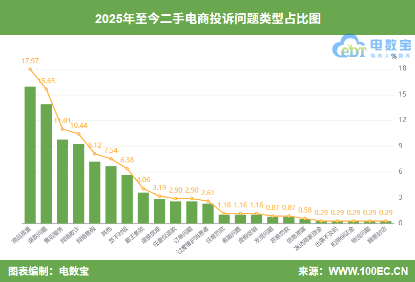 网络消费纠纷调解平台“电诉宝”显示,2025年至今,二手电商投诉涉及的问题包括:商品质量、退款问题、售后服务、网络欺诈、网络售假、货不对板、霸王条款、退换货难、任意仅退款、订单问题、过度维护消费者、任意罚款、客服问题、虚假促销等。