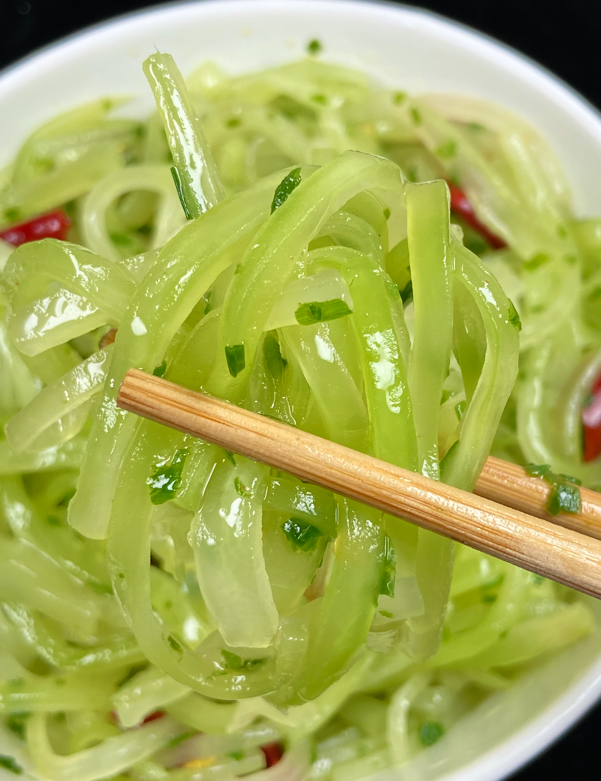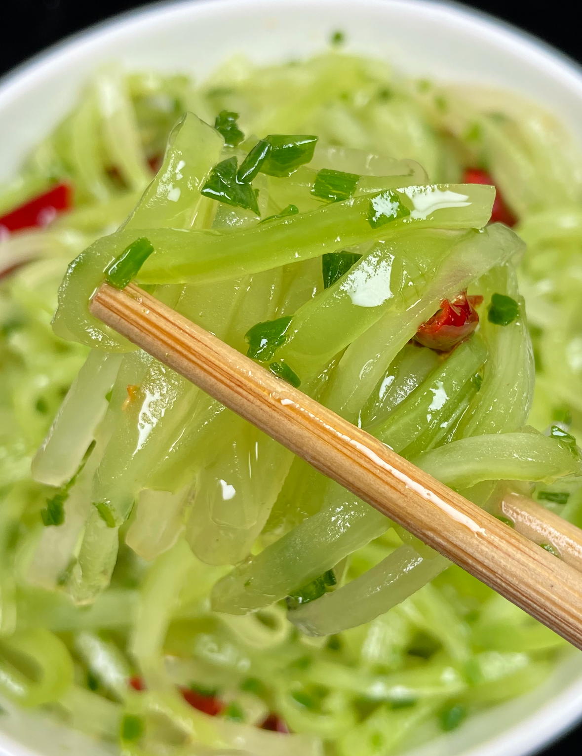 拍照打卡别磨蹭,趁热吃。筷子一夹,莴笋片弯成月牙却不断,送进嘴里,先是葱油的香,像春日暖阳裹住舌尖,紧接着“咔嚓”一声,冰过的脆感在牙齿间开香槟,清甜汁水混着酱油的鲜,从舌尖一路滑到喉咙,解腻程度堪比给胃做SPA。吃完一片想两片,根本停不下来,连碗里剩下的葱油都想拌饭,米饭瞬间多了灵魂。要是家里来客人,提前冰好莴笋,葱油装密封瓶,吃前一分钟组装,面子工程满分,别人还以为你偷偷拜师米其林。