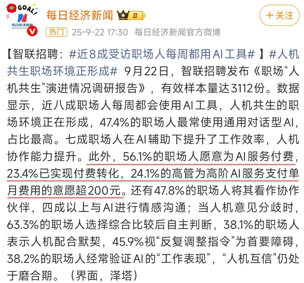据智联招聘2025年调研结果显示,56.1%的职场人愿意为AI服务付费,23.4%已实现付费转化,且24.1%高管愿意为高阶AI服务支付200元以上的单月费用。
