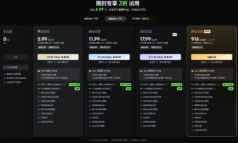 可灵(包月版)黄金会员58元/月;铂金会员234元/月;钻石会员588元/月;黑金会员1149元/月。