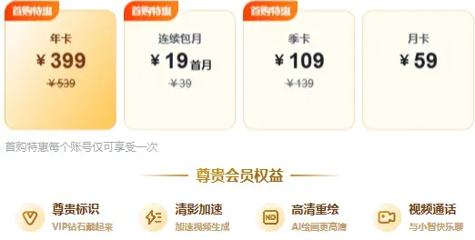 智谱清言的会员月卡为59元;季卡为109元;年卡为399元;连续包月则为39元/月。它倒是没给你整出大杯、超大杯的分级,就是没让人看出啥优势。