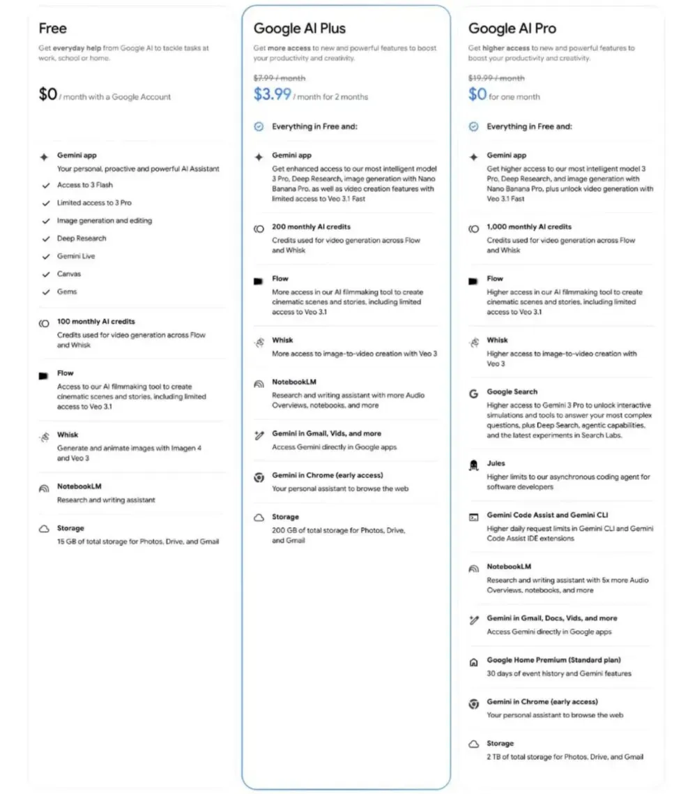 对了,Google除了每月7.99美元的会员套餐,还有19.99美元/月的Goole AI Pro。