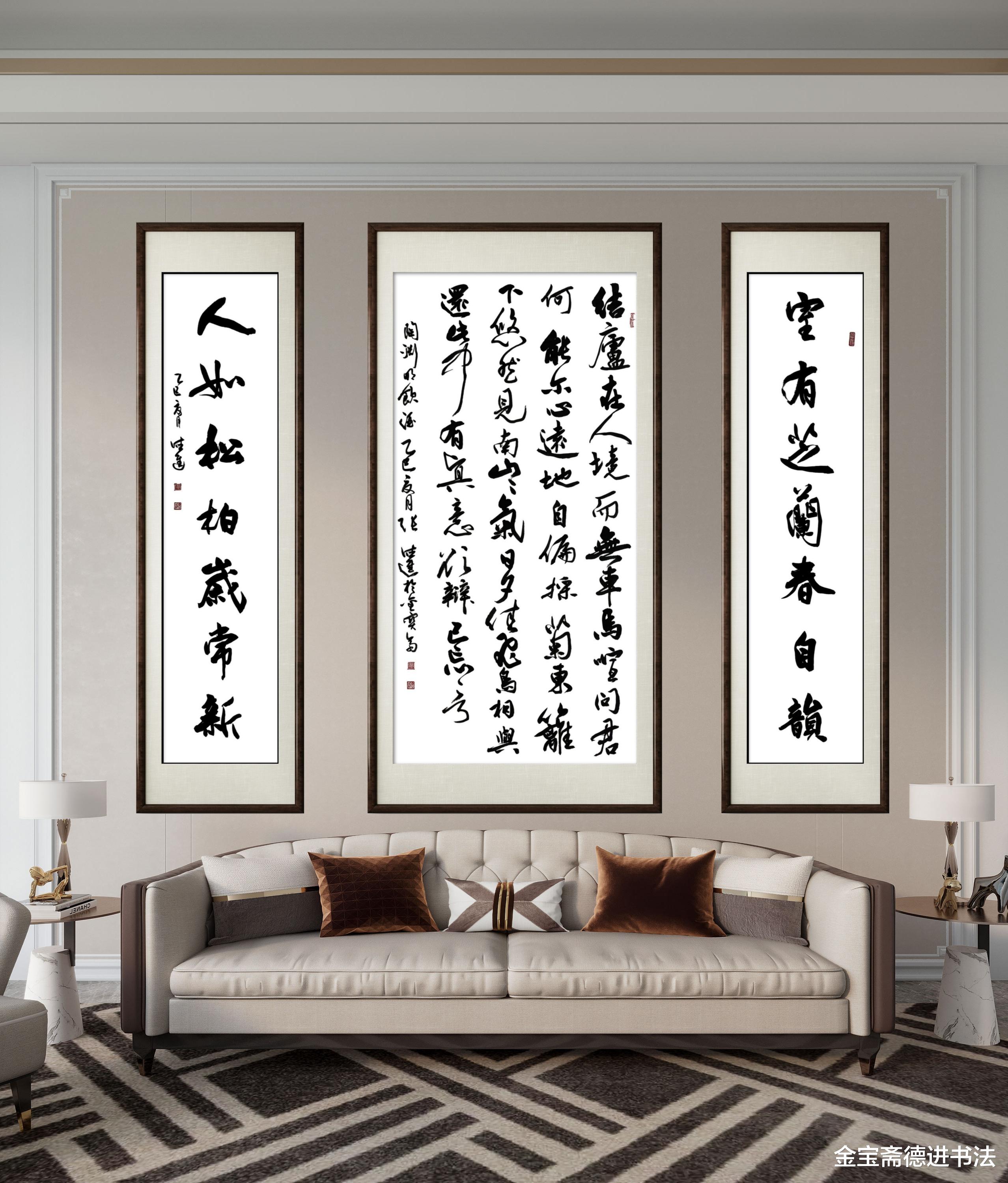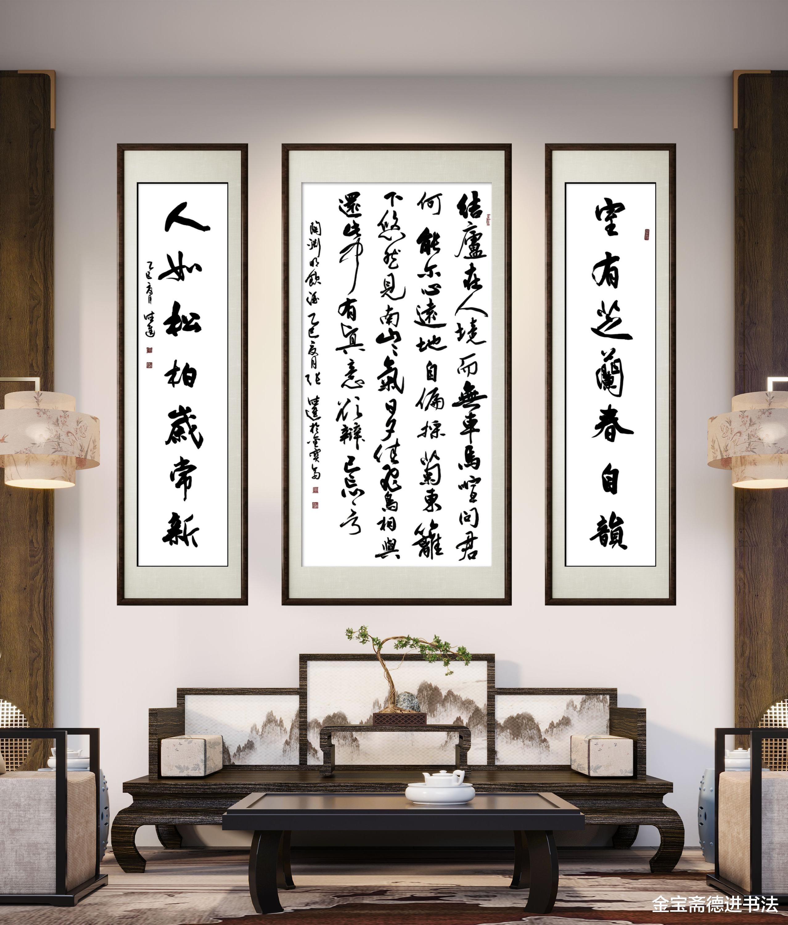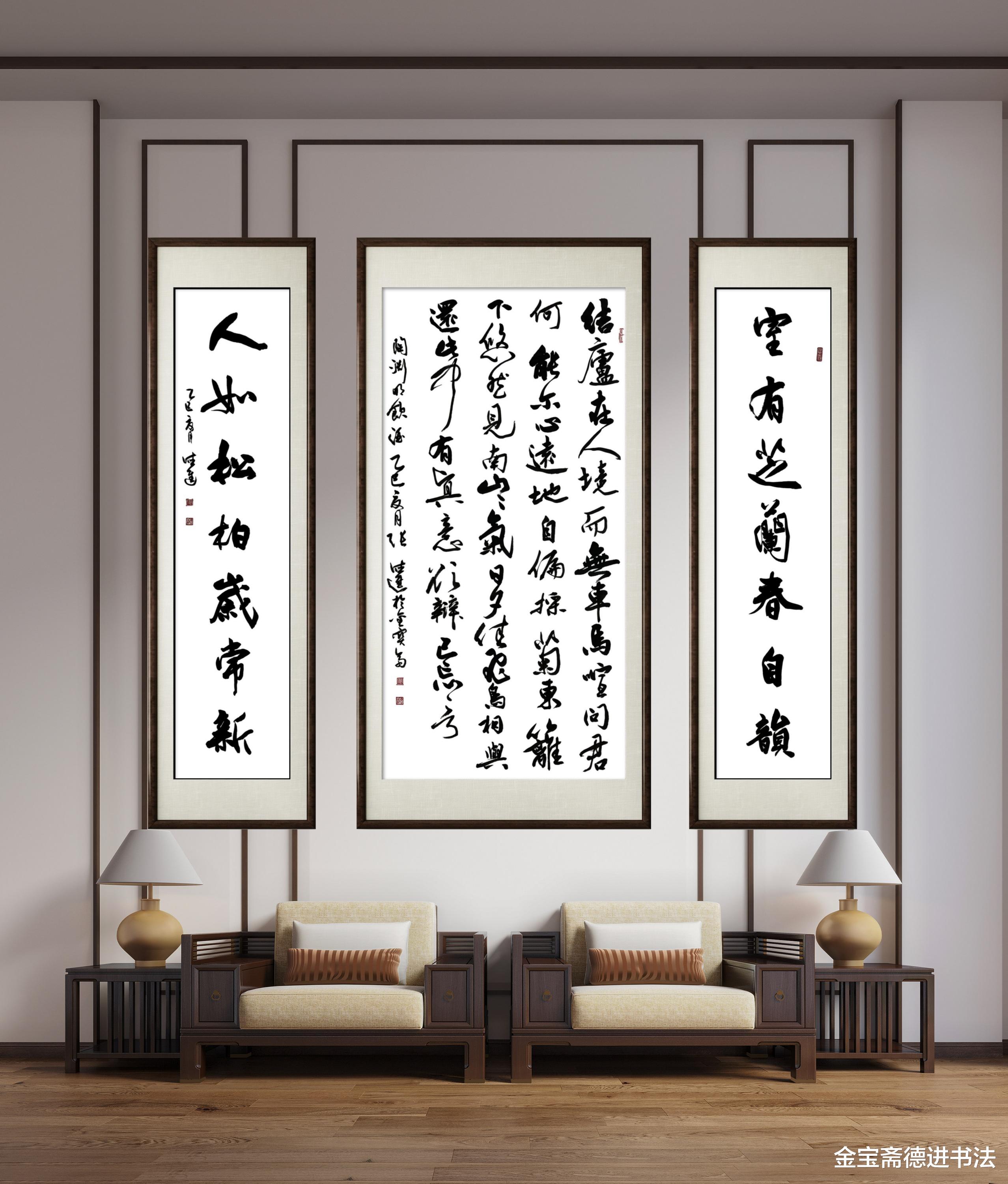 以陶渊明《饮酒》行草书为核心,搭配 “室有芝兰春自韵,人如松柏岁常新” 对联,在家居空间中悬挂,恰似为居所注入清雅文气与生命哲思,既显书法艺术的灵动洒脱,又藏生活美学的温润质感。