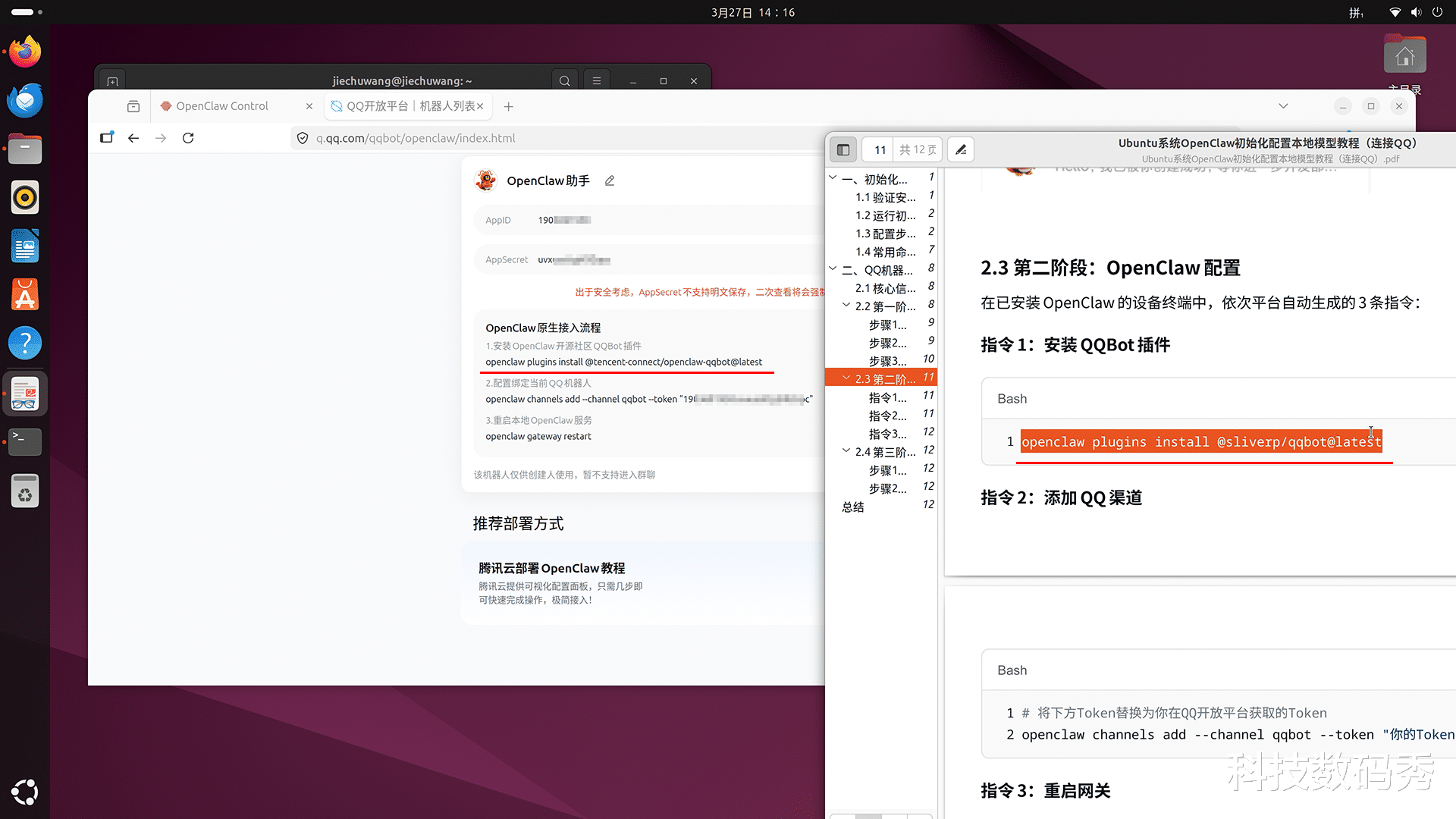 那最后一步当然是和你的QQ连接了,这样无论你人在哪里,只要家里电脑开着,你随时随地都可以让它帮你干活儿,只需要在手机上给你的QQBot窗口里发布一条命令就解决了,这里你可以不按照PDF教程里的命令去做,直接按照QQ官网的命令:openclaw plugins install @tencent-connect/openclaw-qqbot@latest