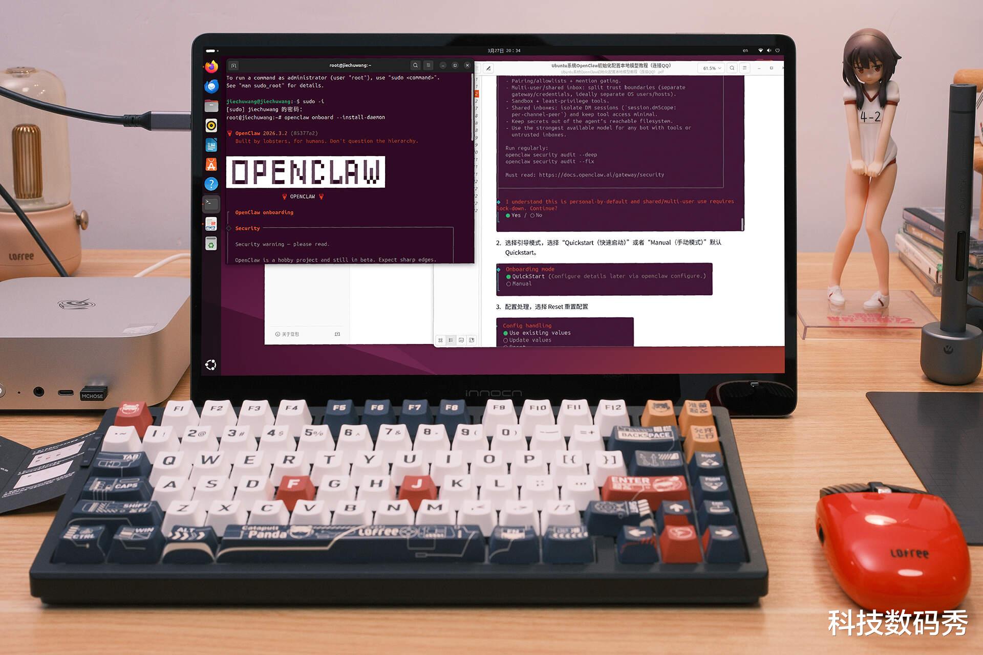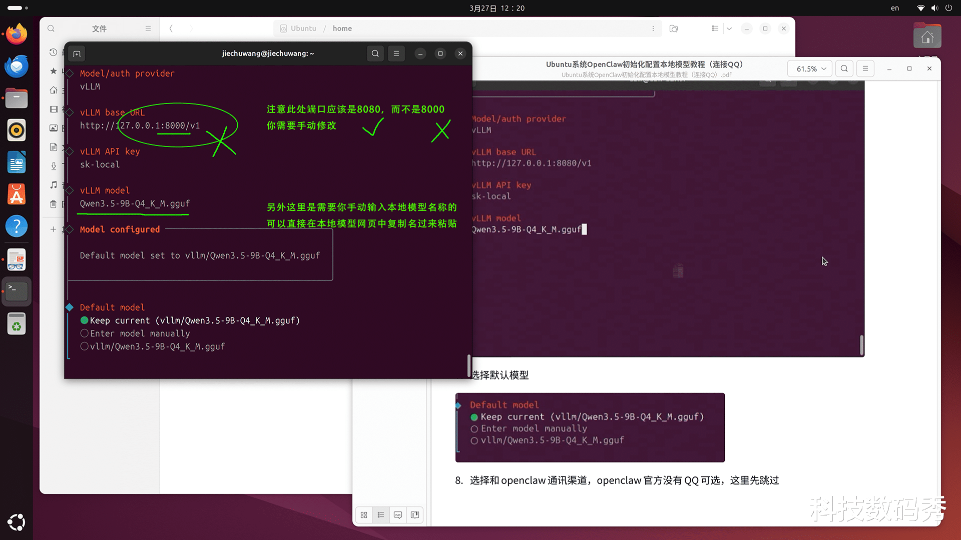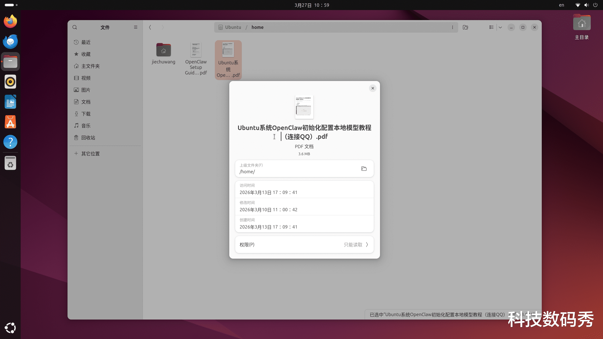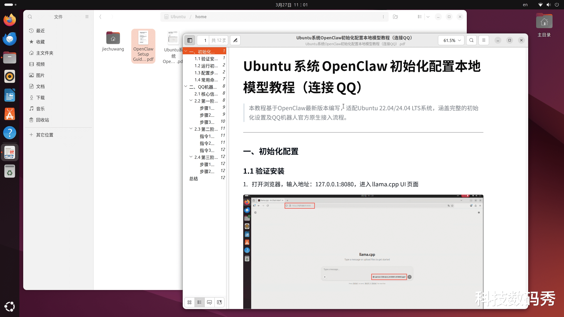 打开左侧文件管理器,直接在地址栏输入:/home,即可看到两个PDF文件,分别是英文版和中文版的《Ubuntu系统OpenClaw初始化配置本地模型教程(连接QQ)》教程,其核心命令就两条:1.openclaw onboard --install-daemon,2.连接QQBot,你只需要按照上面写的选择哪一项就ok了。