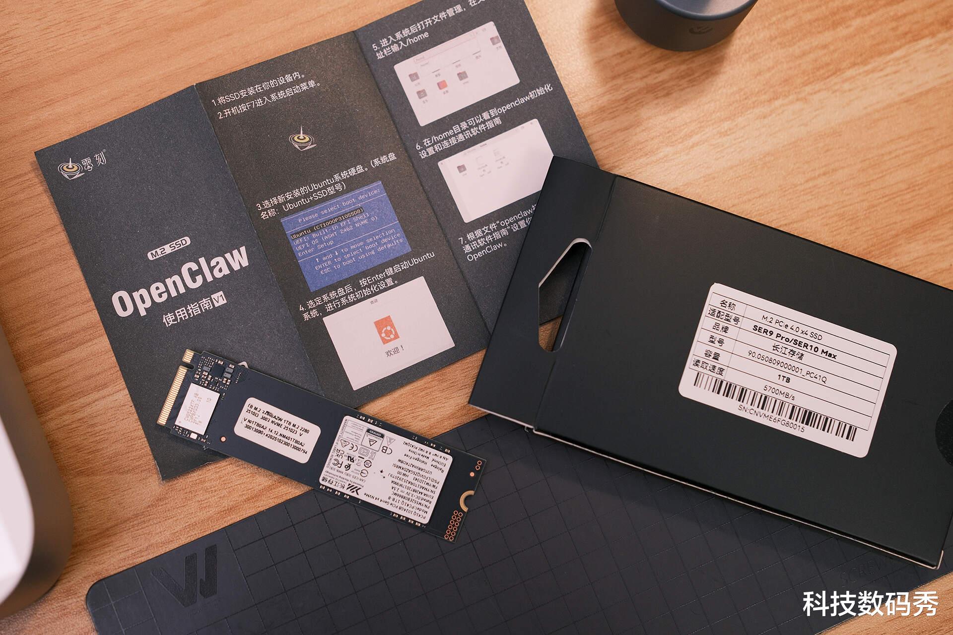 那这块硬盘也是有单独包装的,盒子外观是零刻BeeLink的英文标识以及龙虾的可爱图案,从背部信息可以看出这是张1T的长江存储的M.2 PCIe4.0固态硬盘,读写速度5700MB/s,然后还有一张纸质版的OpenClaw简易使用指南。