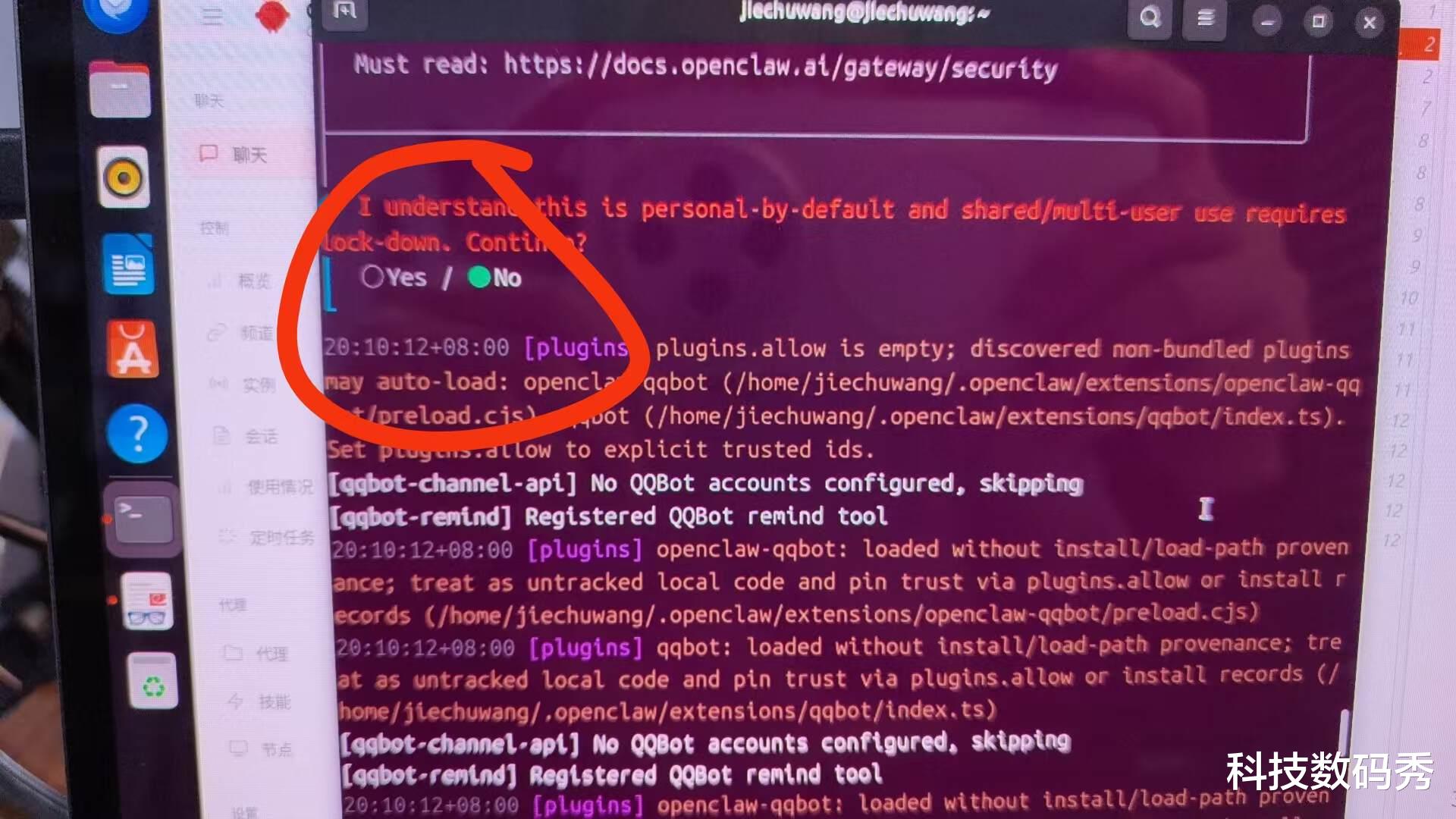 但事实上也可能碰到一些让小白完全不知道怎么处理的问题,譬如教程上输入openclaw onboard --install-daemon的第一个步骤就是“确认是否个⼈使⽤,选择“yes”继续”,然而如果你直接输入的话大概率这一步是直接跳过去的,对于有帐户密码的用户来说,应该输入的是:sudo openclaw onboard --install-daemon,也就是用管理员权限来运行,回车后要输入你的账户密码(和mac终端一样都是不显示密码明文的,不用管,输完后直接回车),然后就会出现正确的第一步“确认是否个⼈使⽤,选择“yes”继续”,而不是跳过。