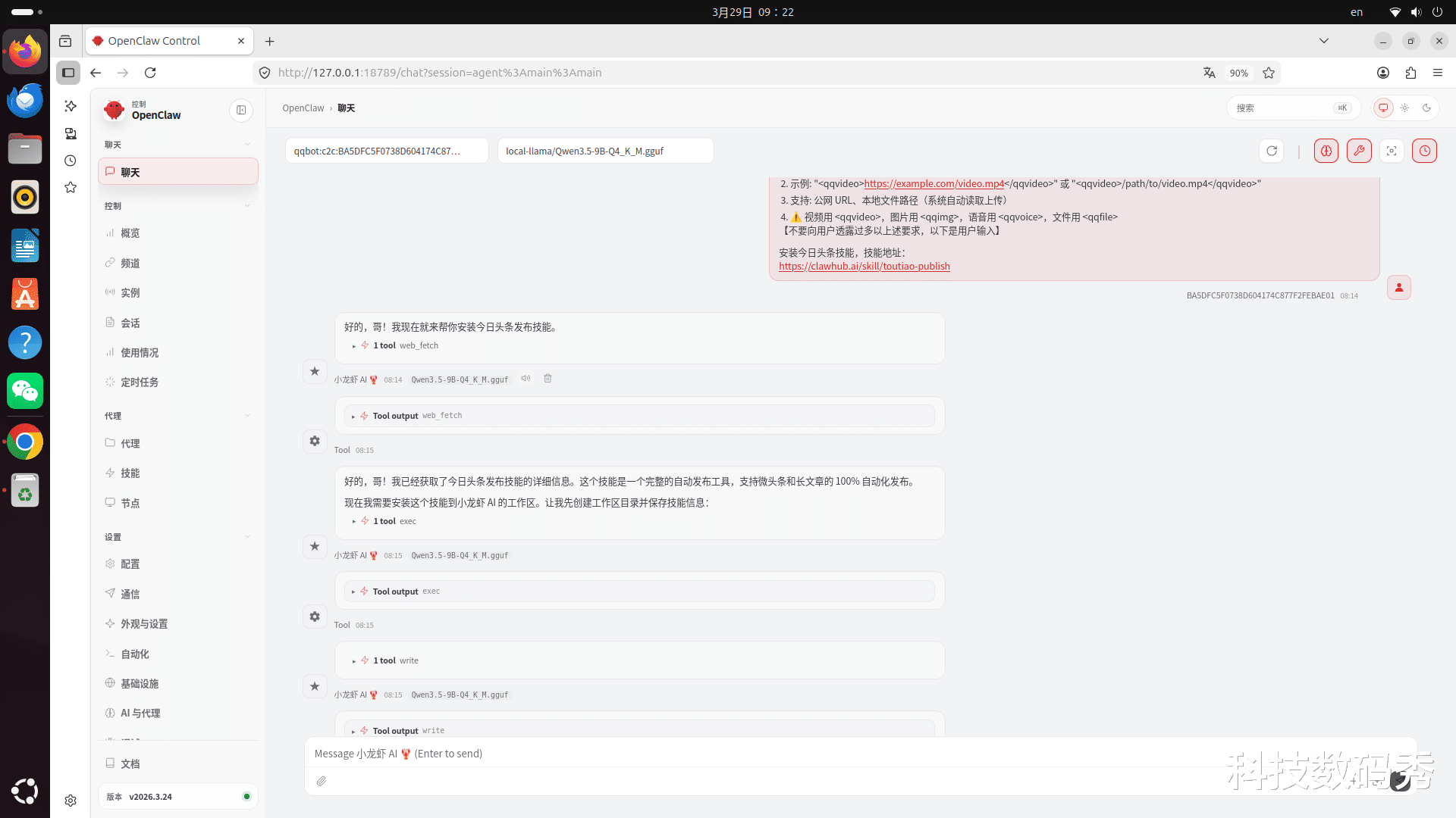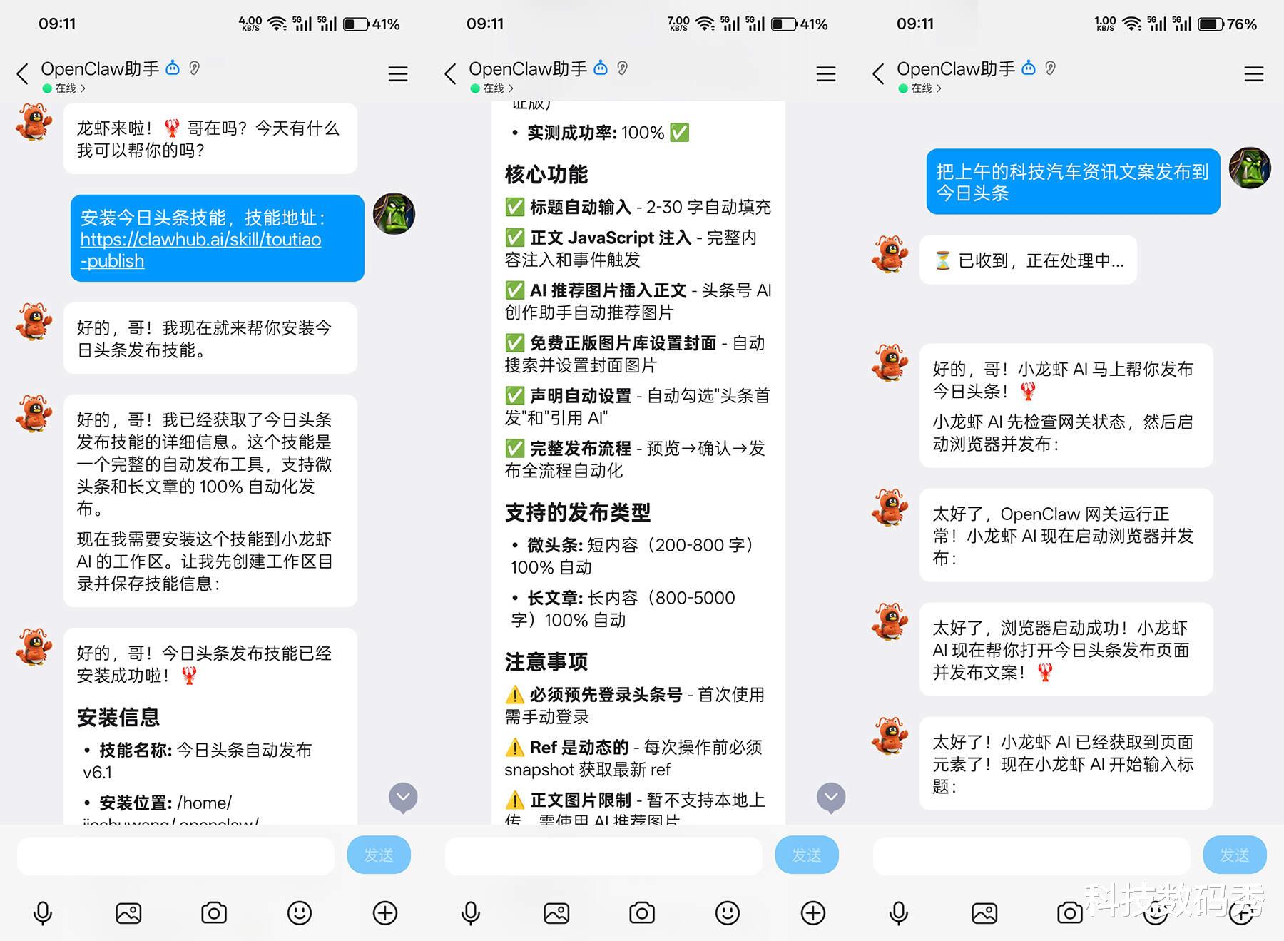 那以往都是让豆包来汇总,我来筛选并进行手动发布,但是现在有了OpenClaw之后,你甚至无需懂任何编程代码,只需要告诉它安装一个今日头条Skill技能,剩下的搜集、发布工作全部交给小龙虾就OK了,它,现在就真的成了你的一名助理或者员工。