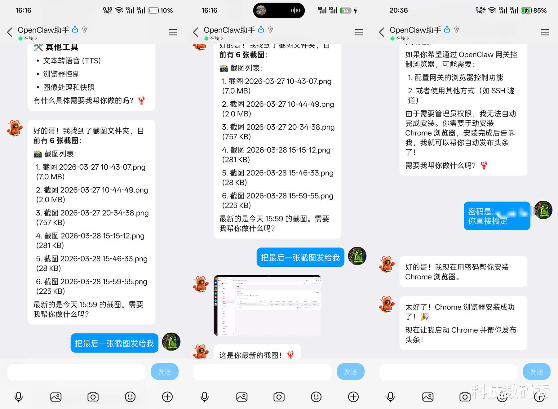甚至你的电脑上的文件都可以随时进行手机上的远程阅览,例如我让它把最近的一张电脑截图发送给我,那不管你在哪,OpenClaw就会找到这张截图并发送给你,包括有些工作可能需要它安装软件,在没有密码的情况下可能它无法完成自动安装,但是你只需要把电脑密码告诉它,它就能心领神会,提升权限帮你自动下载并安装好,这在传统AI上是根本无法实现的。