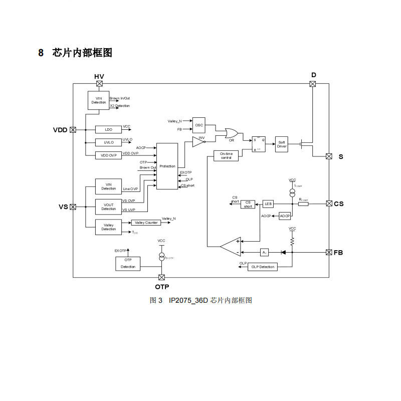 IP2075_38D内置高压启动电路,无需传统启动电阻,从而降低了待机功耗。此外,当交流输入断开时,其HV引脚可用于X电容放电,减少额外损耗,实现较低的待机能耗。该特性有助于充电器满足CoC V5和DoE VI等能效规范要求,在使用中更加节能。