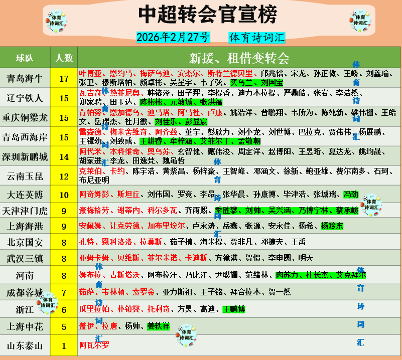 中超2026赛季冬季转会窗刚刚关闭,多只球队在过去的一天里,压哨引进了本土球员,也签约了众多小将。28号官宣的转会汇总如下: