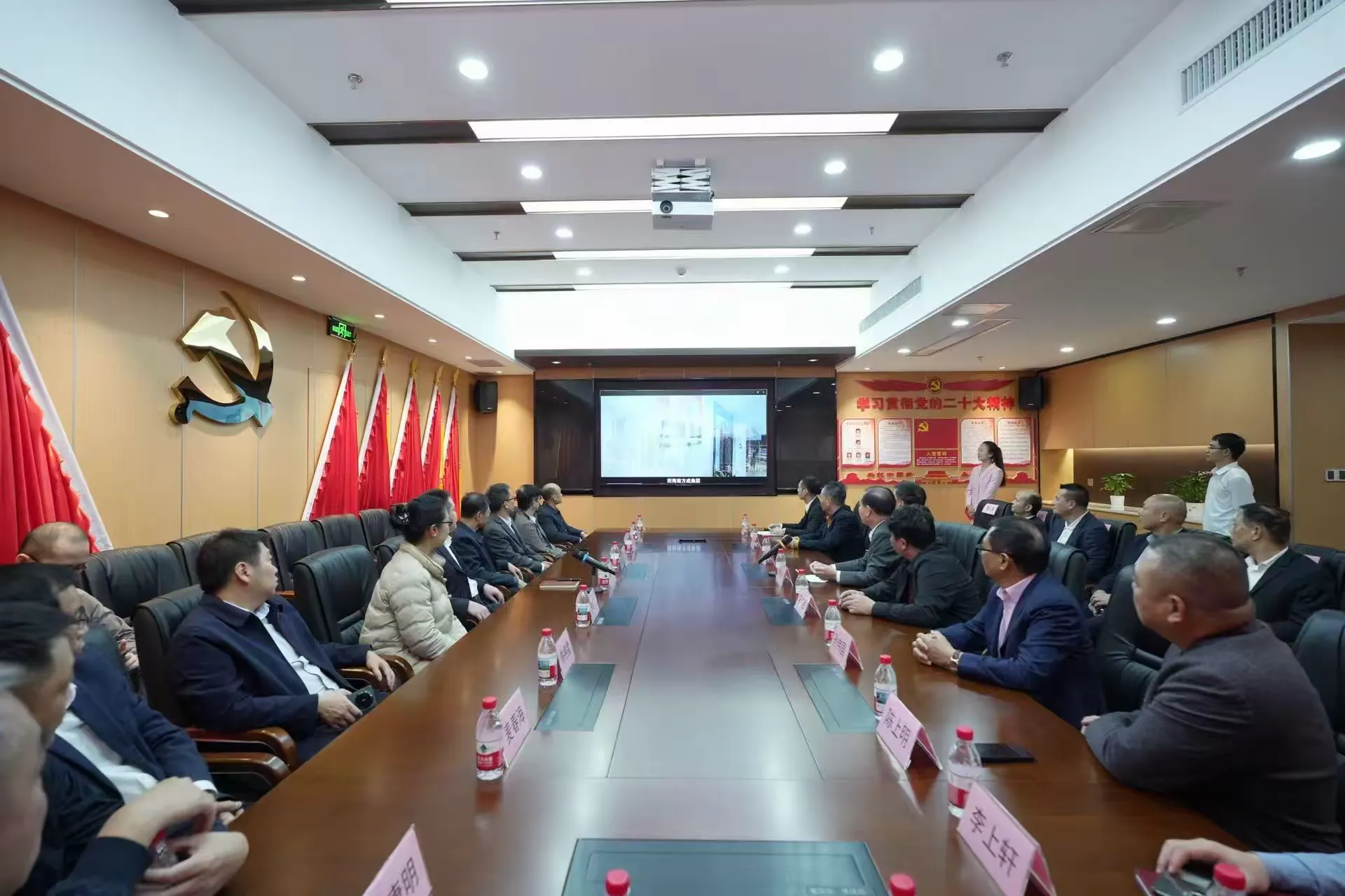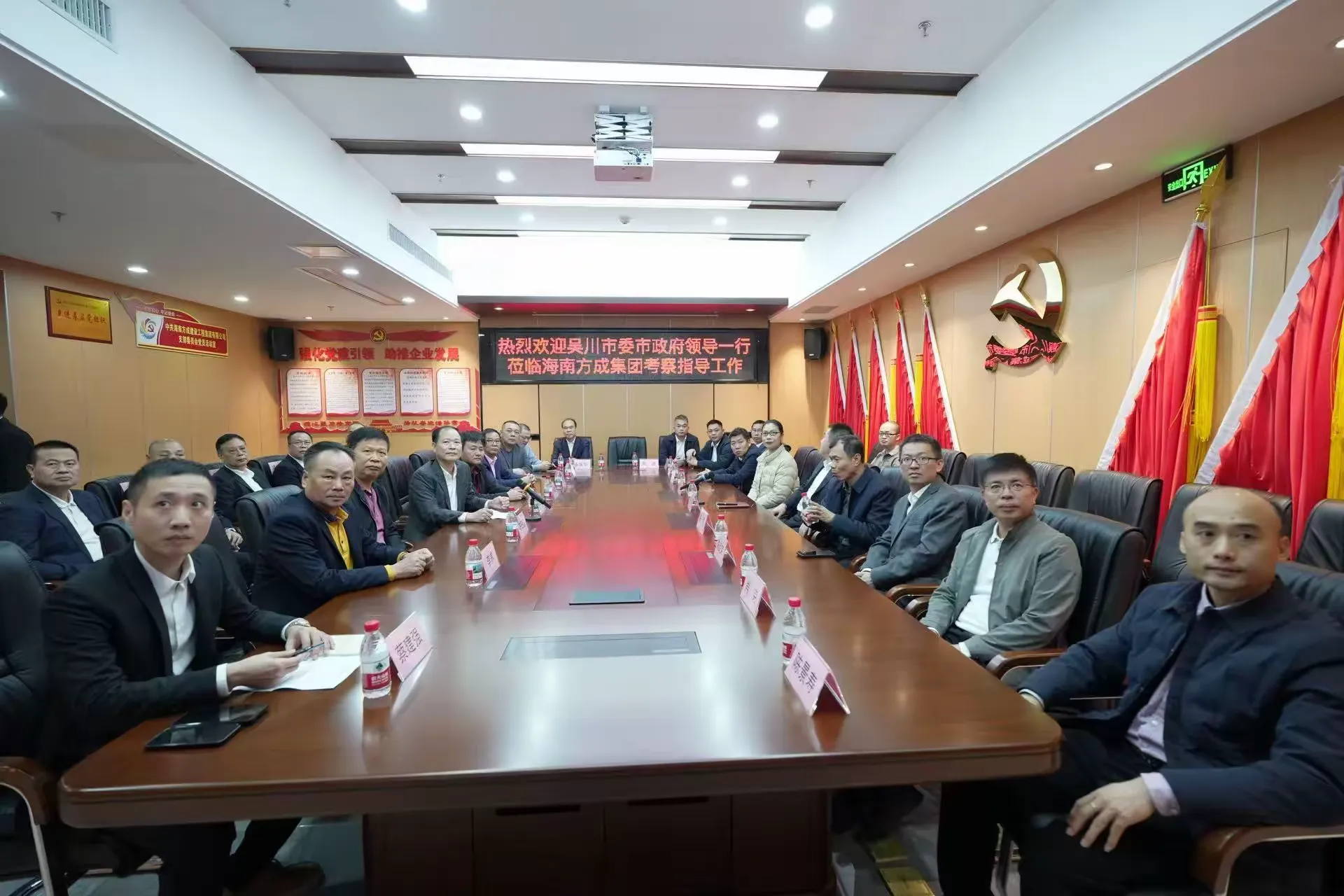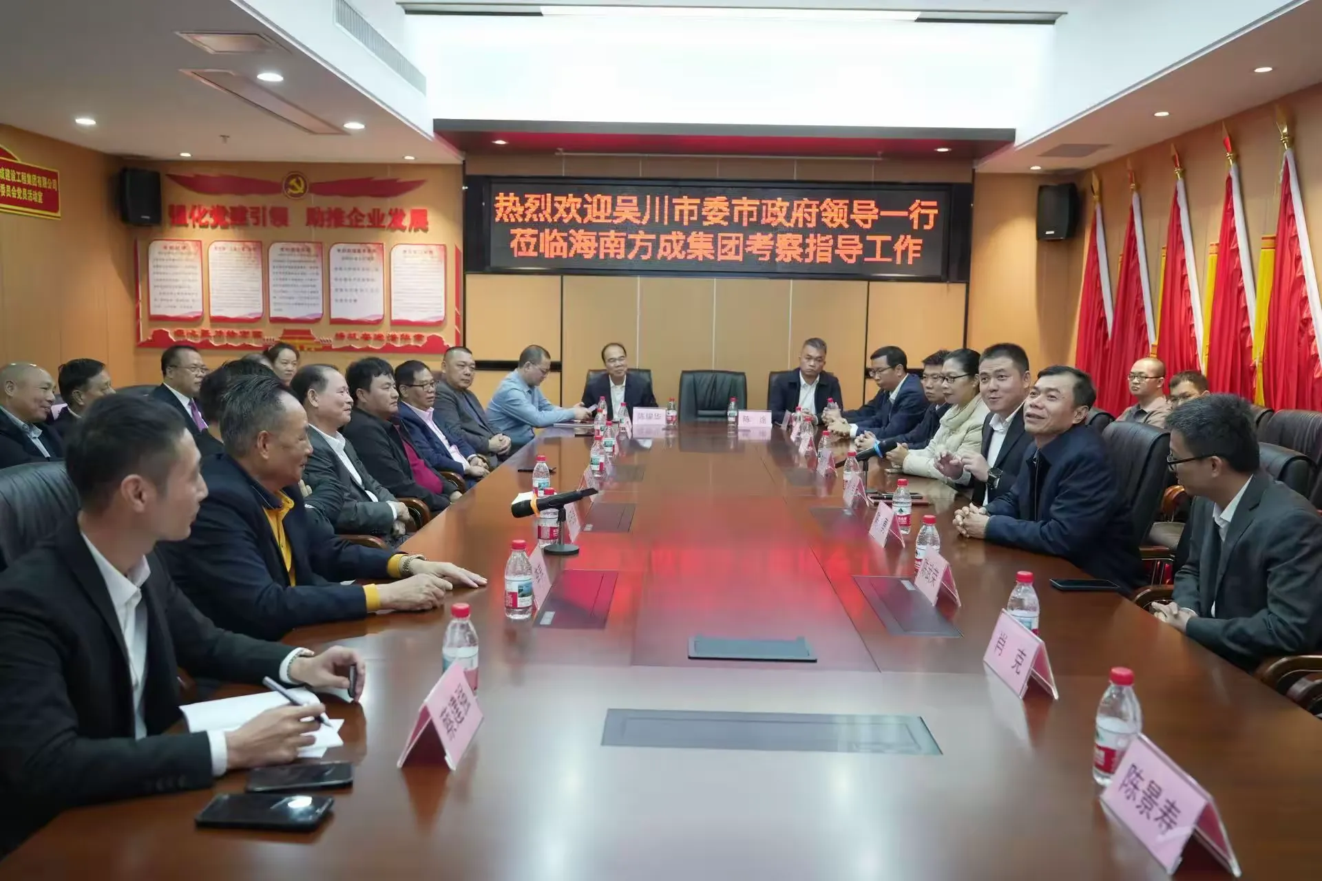 2026年1月4日上午,广东湛江吴川市委副书记、市政府市长刘伟,吴川市人大常委会党组书记、主任陈勇,吴川市委常委、统战部部长李虹飞,吴川市政府副市长陈武荣,吴川市政府副市长陈祺星,吴川市府办主任肖克,吴川市科工贸和信息化局党组书记、局长麦春海,吴川市投资促进服务中心主任易康明,吴川城市发展控股集团有限公司总经理陈途,吴川市发改局党组成员、固定资产投资股股长李上轩一行莅临海南方成建设工程集团有限公司考察指导工作。海南方成集团董事长、海南吴川商会会长兼党支部书记蔡绍方,方成集团副总裁、副会长蔡建强,方成集团副总经理何海兴,商会理事长李伟胜,监事长符日源,名誉会长李养,党支部副书记、常务副会长陈上明,常务副会长孙伟国、李伟宏、林伟强、麦海、凌德智等出席参加本次工作考察座谈会。