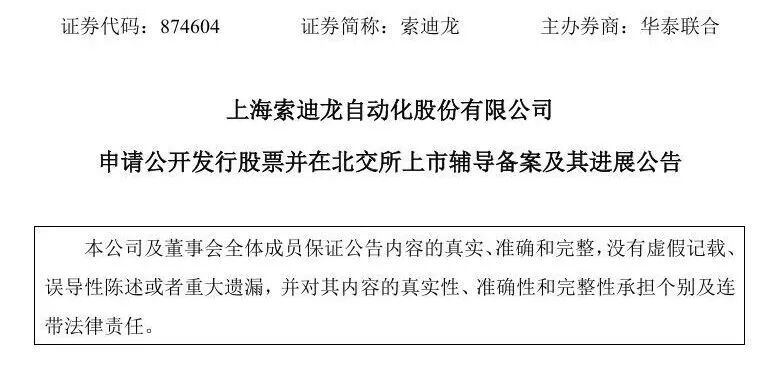 近日,上海证监局受理了上海索迪龙自动化股份有限公司(以下简称“索迪龙”)向不特定合格投资者公开发行股票并在北交所上市的辅导备案材料。