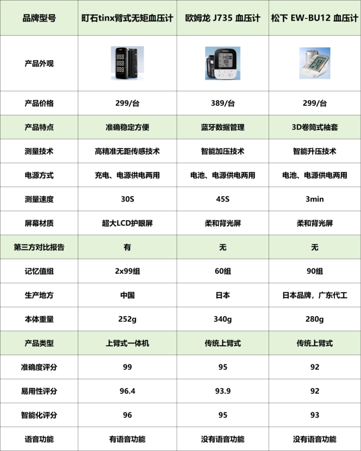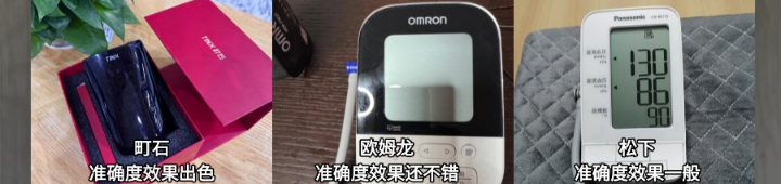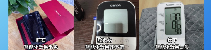 测评结果:町石 > 欧姆龙 > 松下町石血压计易用性测评表现町石血压计的易用性非常突出。启动到测量完成只需要15秒,在这三款血压计中速度是最快的。操作上非常简便,不管是年轻人还是长辈都能很快上手。而且,它的智能算法挺先进的,能根据不同的环境自动调整测量参数,确/保即使是在吵闹的地方,结果依然稳定可靠。这款血压计在家庭使用时非常方便,操作简单又高效,绝对适合所有人,使用起来没有任何障碍。欧姆龙血压计易用性测评表现欧姆龙血压计的易用性表现还算可以,虽然没有什么惊艳之处。测量时间大约需要25秒,对于急着要结果的人来说可能会觉得有点慢。操作界面挺简洁的,按键设计一目了然,尤其适合老人使用。不过,在一些嘈杂环境下,它有时会出现卡顿的情况,导致测量数据的稳定性受到影响。总体来说,它适合日常家庭使用,虽然速度上不如町石,但在稳定性上还是不错的。松下血压计易用性测评表现松下血压计的易用性表现还算可以接受,没有特别突出之处。测量时间大约需要30秒,相比其他两款,速度略显拖沓。操作起来也不复杂,按键设计简单清晰,但在噪音较大的环境下,按键可能反应不灵敏,需要重复按压才行。这款血压计在安静环境下的表现还不错,数据较为清晰,但在嘈杂环境中,它的稳定性差了一点,总体来说,松下适合在家里安静的地方使用,但在外面使用时可能会有点不稳定。