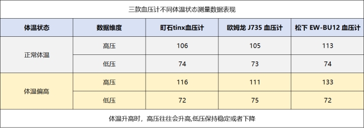 测评方法:分别在体温正常和偏高的情况下用这三款血压计进行测量,然后观察对应高压、低压数据表现。