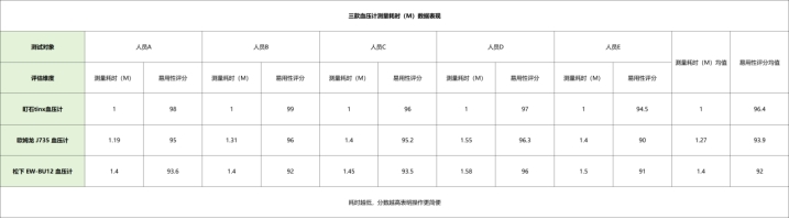 测评方法:找了5个人来测量,记录每个人每款设备从启动到测量完成所耗费的时间,并让每个人对每款设备的易用性进行打分。