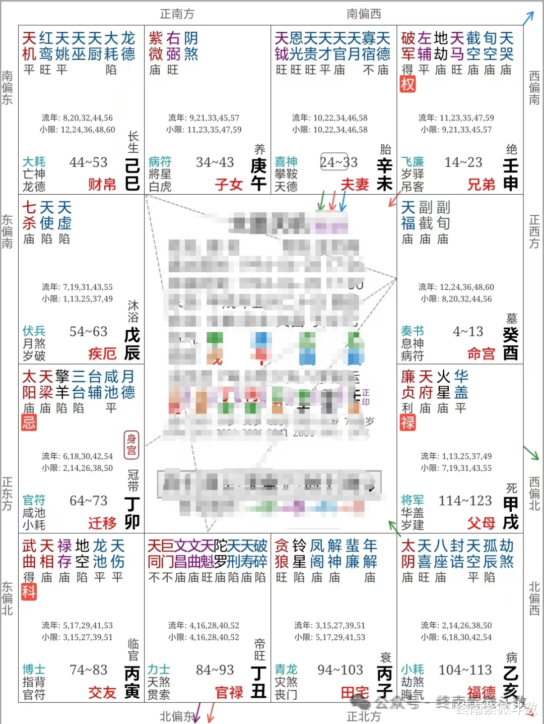 财帛宫武曲禄在交友,赚的是众生之财,也可以理解成服务众生百姓的行业;官禄宫自化权忌,综合来看,父母宫和官禄宫没有很好的交易象,所以天生没有吃公家饭的格局。没关系,选择家族产业去继承,跟着做就可以了。