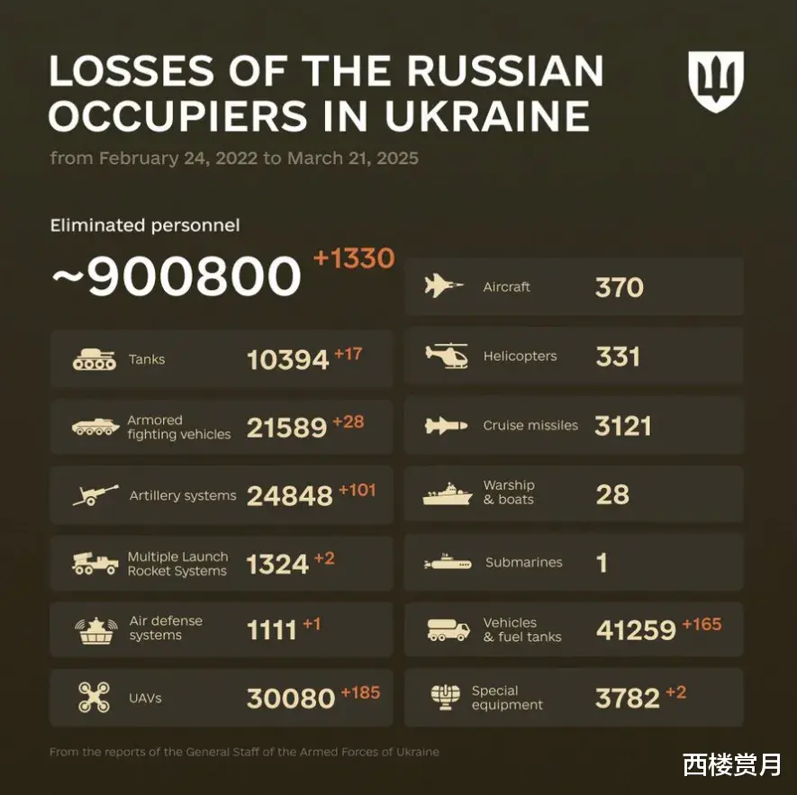 乌总参公布的昨日战果,歼敌(毙+伤)1330人。