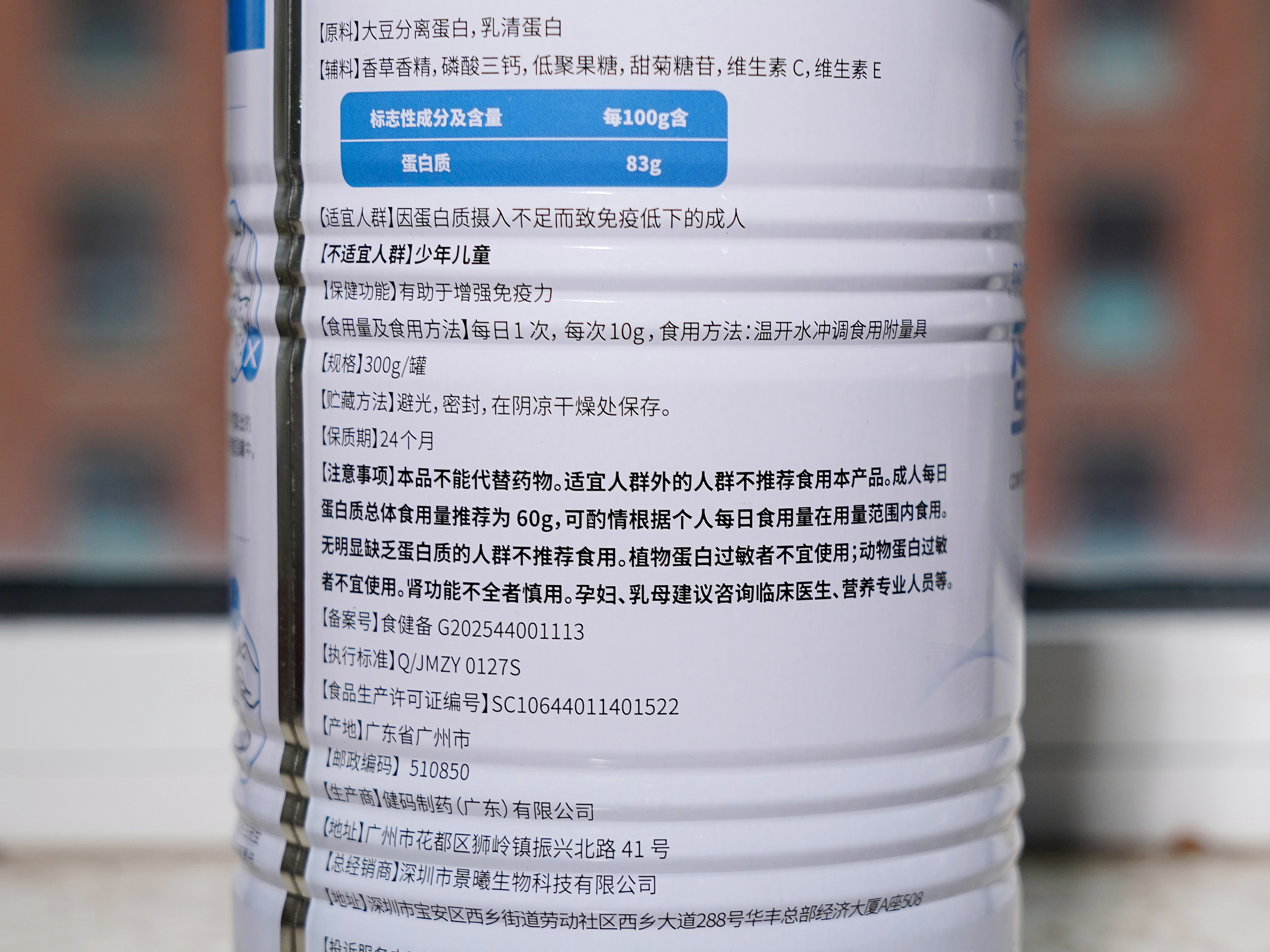 ▼来看下配料表:原料占比98%,只有大豆分离蛋白和乳清蛋白,辅料占比2%,磷酸三钙(补钙)、低聚果糖(益生元,调理肠道)、甜菊糖苷(天然代糖)、维生素C+E(增强免疫)、可食用香草香精(提味),也都各有作用,总的来说配方非常简单干净,没有乱七八糟的添加剂如色素、防腐剂等,连甜味剂也是天然的甜菊糖苷,而非人工代糖。配料表下面还标注了每100g中含有83g的蛋白质。一般认为100g里含蛋白质80g才算优质,在品质方面,AQrin显然做到位了!