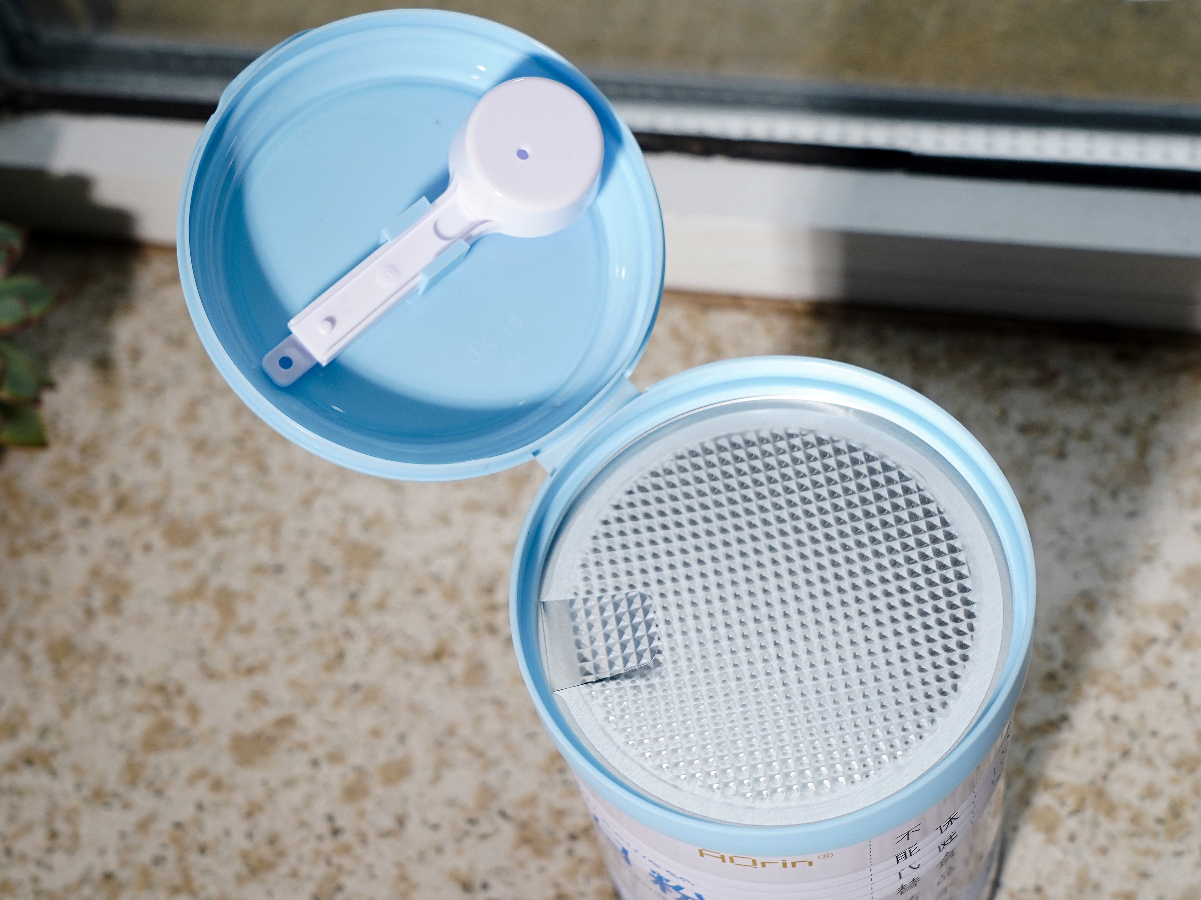 ▼打开罐盖,内层还有密封铝膜,能隔绝潮气和污染。盖子上还固定了一个折叠勺,设计了卡槽,不用在粉里“找勺子”,非常卫生。