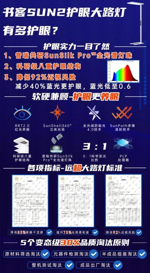 在护眼养眼的核心技术领域,Suker书客实现了行业级的重大突破。经过10年生物光学技术攻关,书客首创RRT2.0红光养眼黑科技,能精准截断400-455nm有害蓝光波段,同时大幅增强有益红光的能量输出,不仅有效延缓用眼疲劳,还能将近视风险直降 92%,甚至还搭配了美国普瑞Bridgelux联合定制的SunSilk Pro™类太阳全光谱灯珠,针对青少年与儿童用眼场景重新设计光谱结构,深度压制有害蓝光(400–455nm),同时补足关键绿光与红光波段,让光谱曲线趋近完美的自然太阳光。