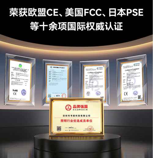 面对市面上不少护眼台灯光学技术落后、蓝光危害高、性能半年就衰减的现状,书客自研18大核心护眼科技,超过3200小时的实验室护眼模型训练,对光谱分布、视觉舒适度及长期用眼安全性进行深度验证;其后,完成 58项光健康干预测试,涵盖频闪控制、蓝光能量管理、光照均匀度等核心维度,确保每一束光都符合医学级护眼标准。从光源芯片到光学结构全链路升级,直接通过超常规10年光学性能抗衰减认证。光谱精度、光源稳定性和安全性均比行业标准高出五倍,真正做到长时间稳定护眼。书客在研发环节引入了系统性的科研级验证流程,同时书客还拥有着欧盟CE、美国FCC、RoHS等十余项国际权威认证,下图为suker书客品牌各种权威机构认证图:
