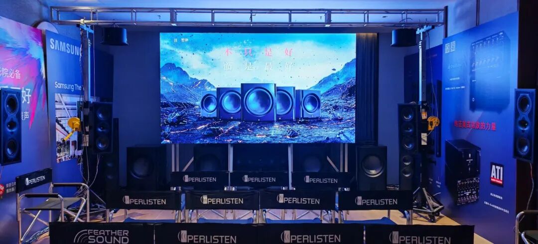 本次展会最大的亮点之一,要数540 展厅的旗舰 Hi-End 全景声影院,以 9.6.4 声道架构、19 通道的豪华配置,构建起家庭影院领域的 “技术新标杆” 与 “沉浸体验范本”。由羽声科技主导的该影院,融合了专业声学设计、顶级系统整合与高阶空间美学,为观众能领略家庭影院所能绽放的震撼力与纯粹影音魅力,提供了更大可能。